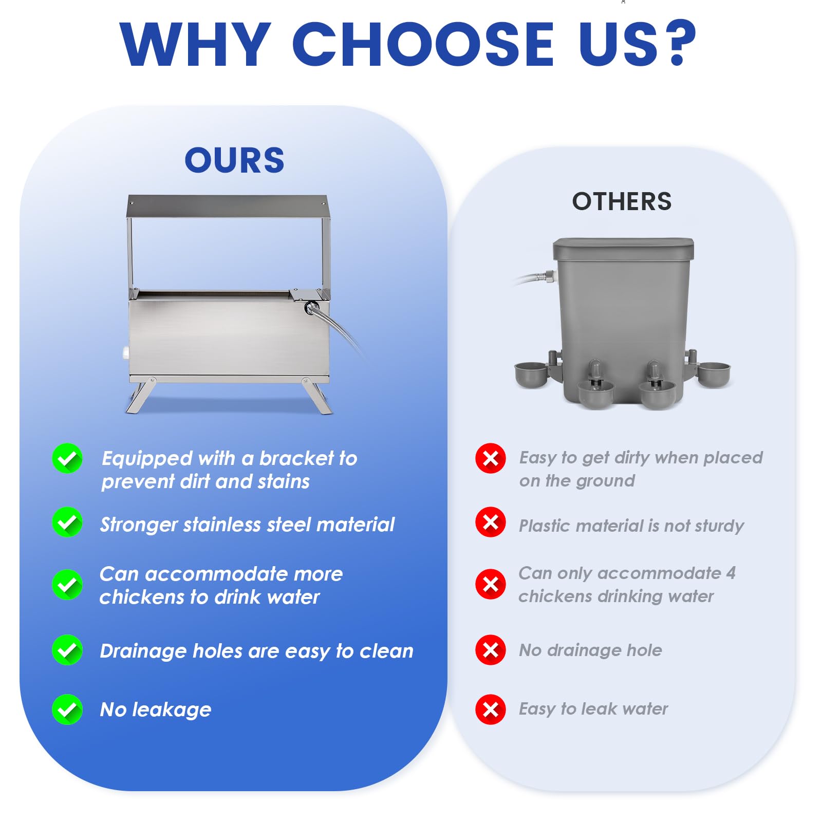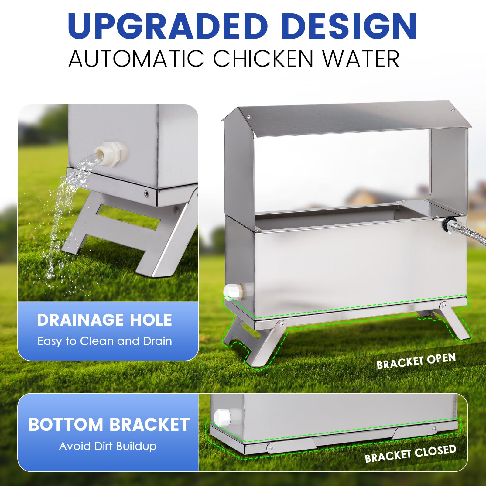 【Stainless Steel Chicken Waterer】The metal chicken water is made of stainless steel,which will not rust and is highly durable.It is resistant to deformation and can withstand various weather conditions.This design offers a long service life and is superior to plastic chicken waterers.