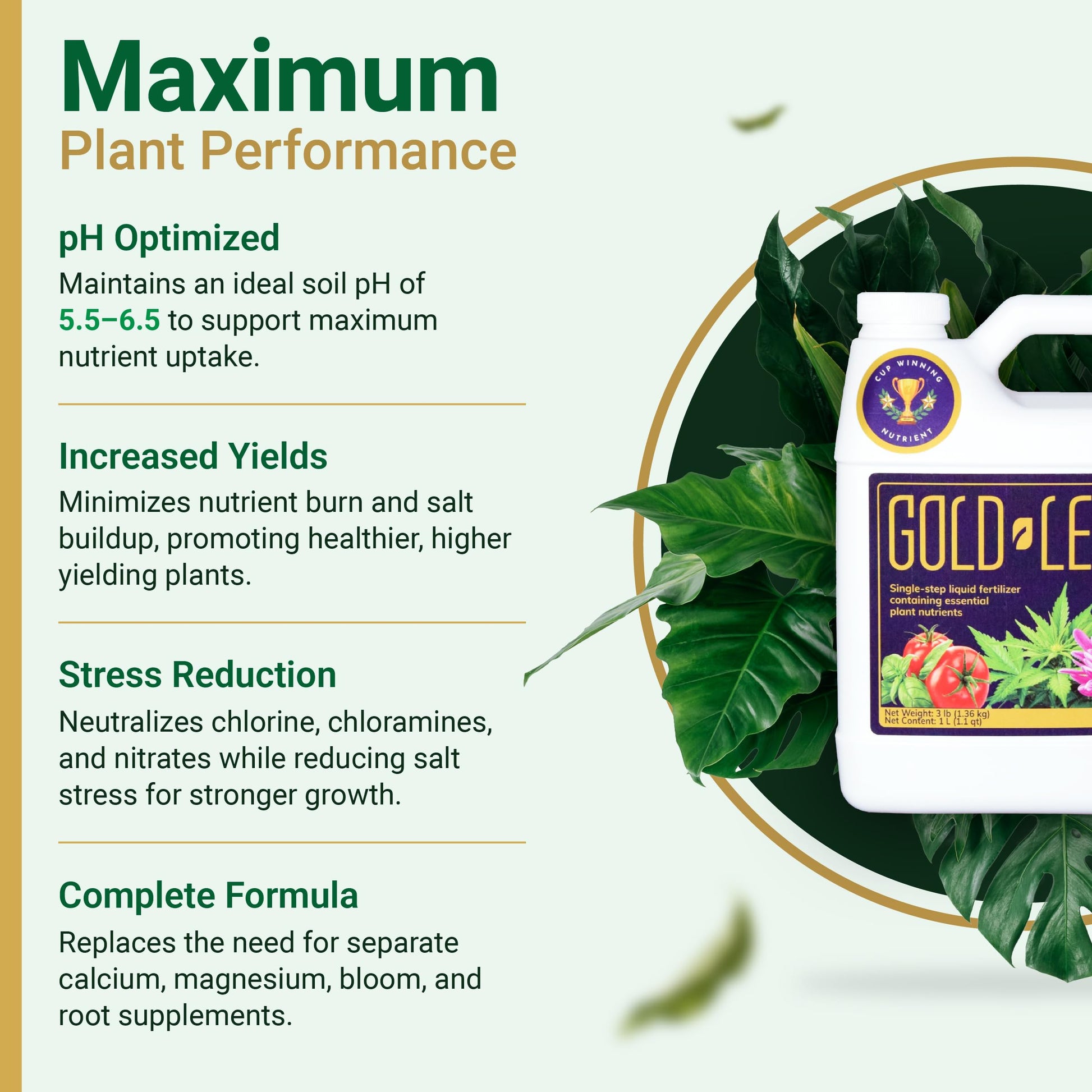 Optimized pH for Peak Growth: You will never have to worry about your pH again. Gold Leaf keeps your crops in the ideal range of 5.5 to 6.5 throughout the grow, with no adjustments required.