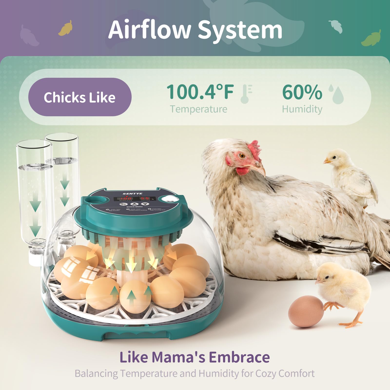 HUMIDITY CONTROL & AUTOMATIC WATER REFILL - Equipped with 2 gravity water bottles for automatic water refill, our egg incubator ensures optimal humidity levels are maintained without the need to disrupt the hatching process by opening the lid.
