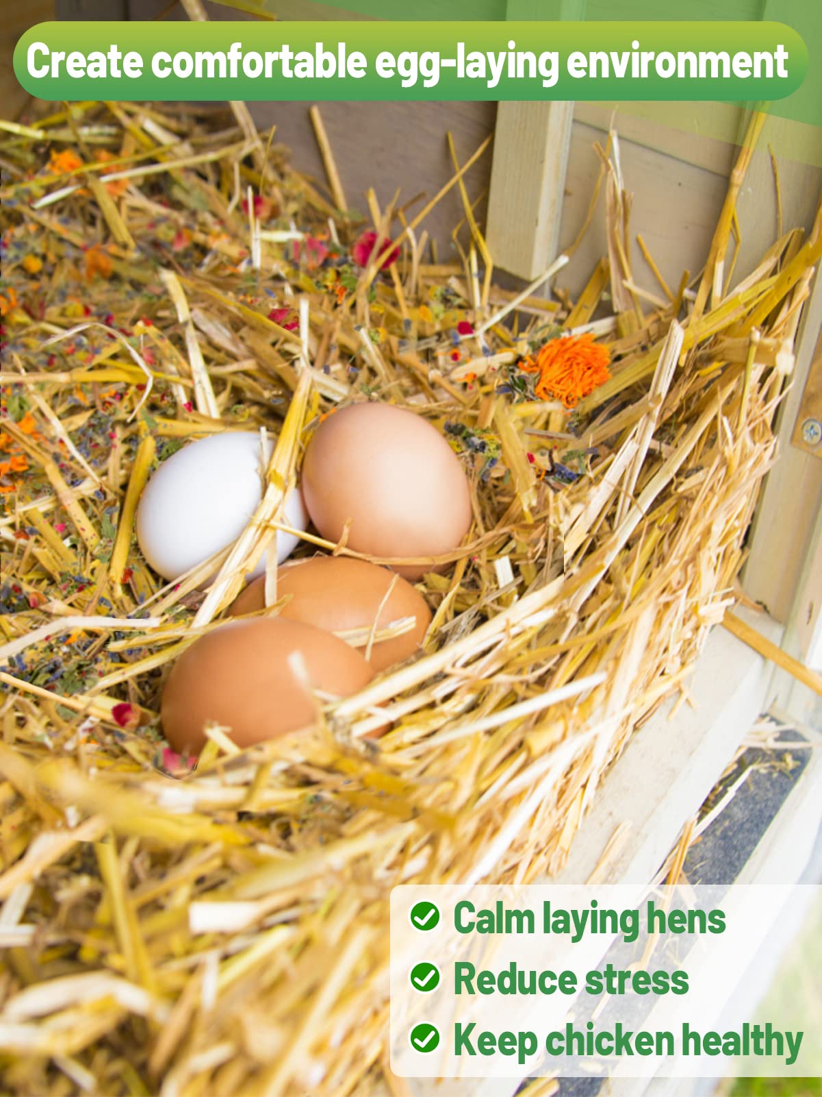 Natural Chicken Nesting Herbs: The hen feed supplement uses natural dried flowers and herbs, carefully selected and naturally air-dried, safe, non-toxic, edible and free from any chemical elements, your hens ducks or other poultry will enjoy it.