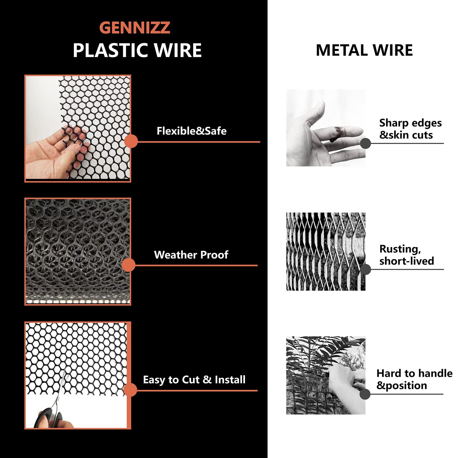 ▦【Zip Ties Included】- GENNIZZ plastic mesh fence is easy to install, remove, roll up and store, zip ties included in the package, install with T-posts or stakes posts to avoid collapsing or sagging caused from wind blowing, animal clash or heavy snow pressure