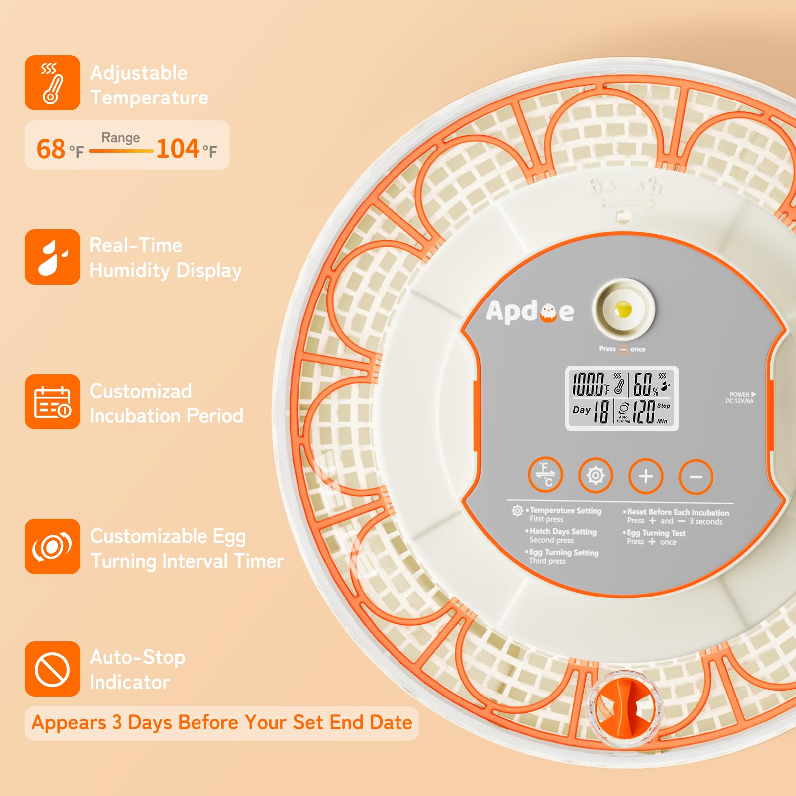 Enhanced Egg Turning Feature: The Apdoe HatchPro Elite egg incubator features an automatic turning function that stops automatically four days before hatching, complete with a countdown timer. Customize the turning time intervals to your preference—choose from 60, 120, or 180 minutes.