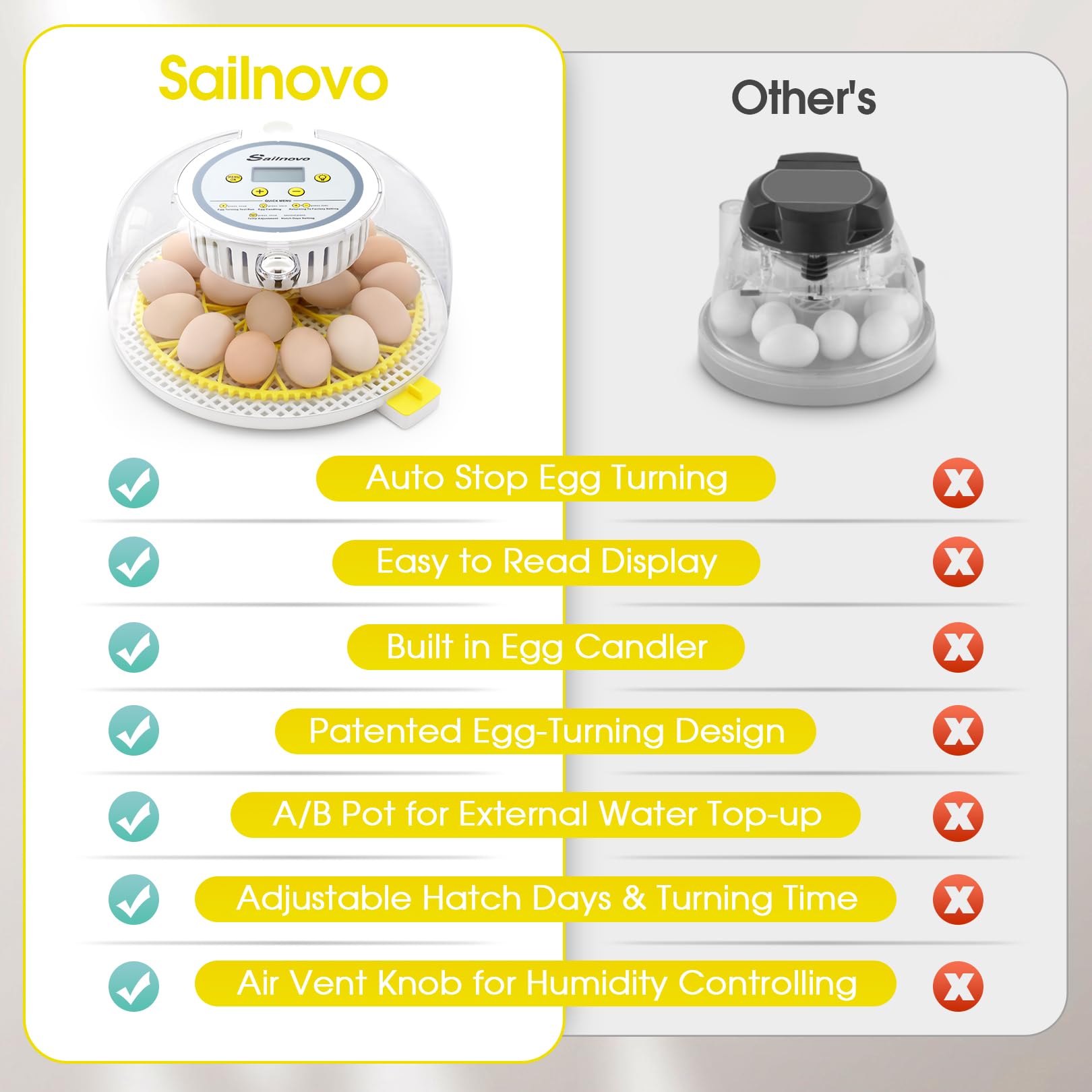 AUTOMATIC EGG TURNING: Sailnovo 18 egg incubator is equipped with an automatic egg turning function to avoid eggshells and egg membranes from sticking together, and improve the reproduction rate of hatching eggs; you could add water without opening the incubator lid to avoid fluctuations in temperature and humidity, and the incubator chassis is easy to disassemble for easy cleaning.