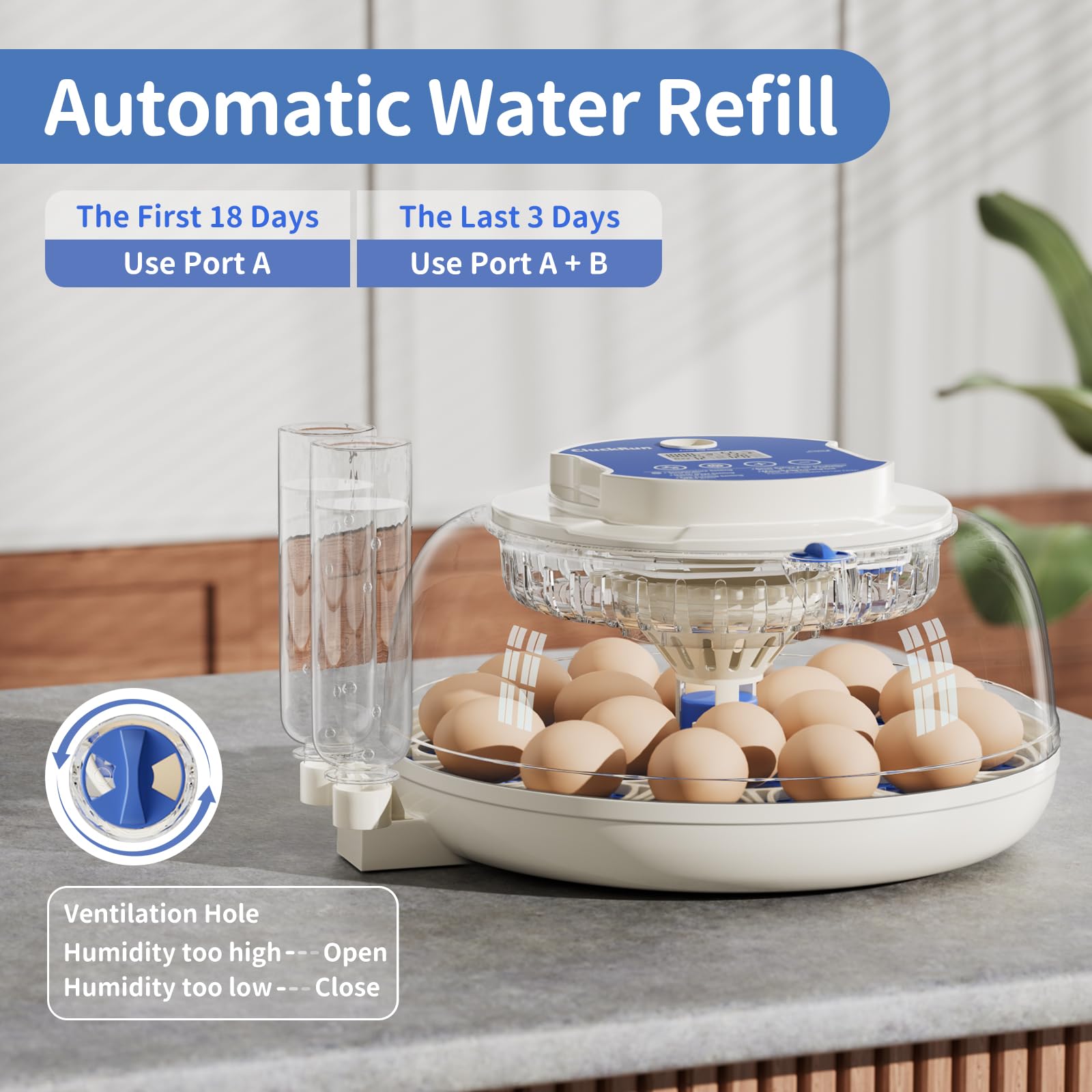 Effortless Humidity Management: Featuring AB humidity trays and dual external water bottles, our design minimizes the need for frequent refills. Enjoy a stress-free incubation process with automatic humidity control that adapts to your needs.