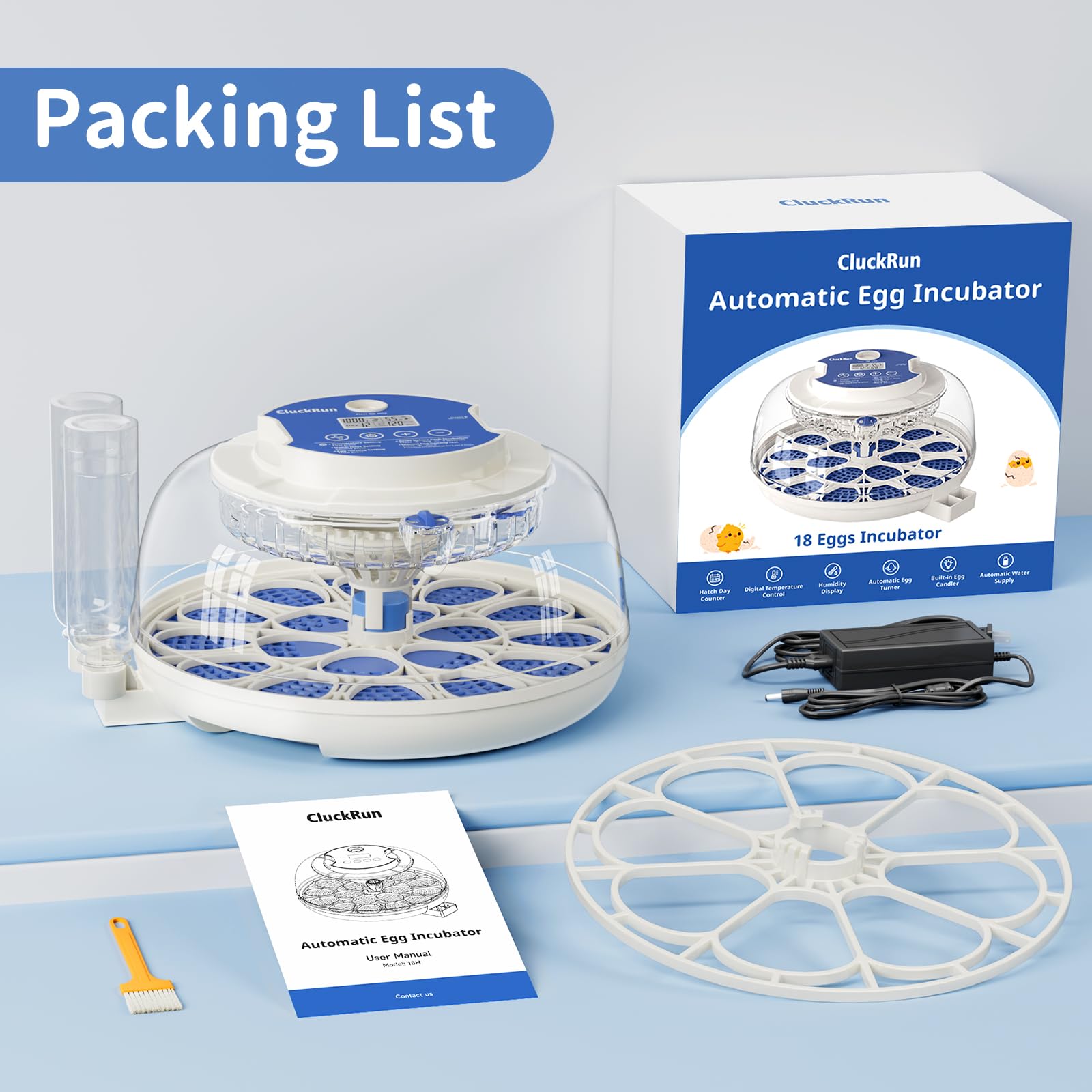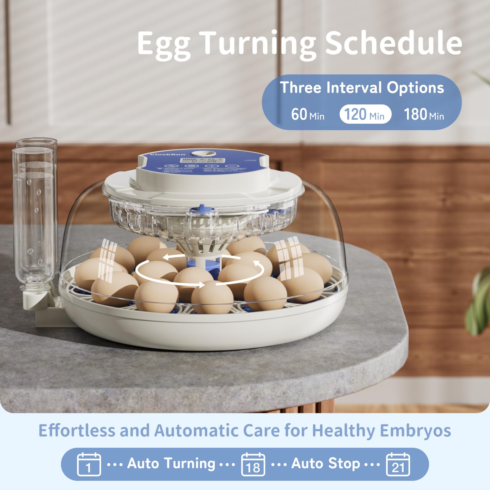Enhanced Egg Turning Feature: The Cluckrun 18 egg incubator features an automatic turning function that stops automatically four days before hatching, complete with a countdown timer. Customize the turning time intervals to your preference—choose from 60, 120, or 180 minutes.