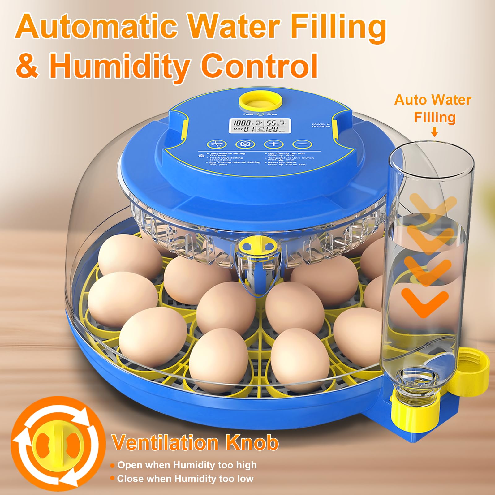 【Stable Humidity with External Water Refill】 Add water via external bottle without opening the incubator. Dual channels maintain humidity for higher hatch rates. Water level window for easy monitoring.