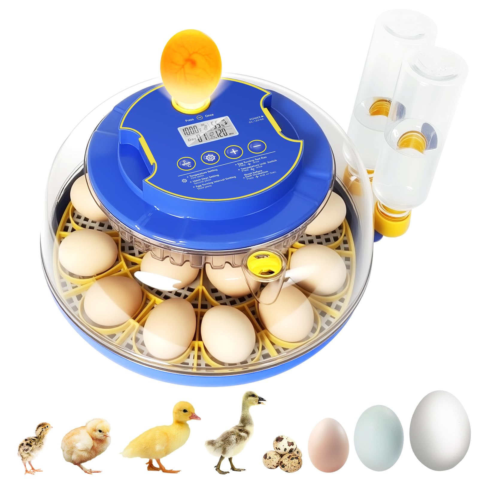 【Precision Smart Display & Alarm System】 This 18-egg incubator features an LED display that lets you set and read temperature in Fahrenheit and monitor humidity in real time, making it easy to control the hatching environment and improve hatch rates. It also includes a temperature and humidity alarm system—no need to buy separate monitoring devices—making incubation simple and efficient.