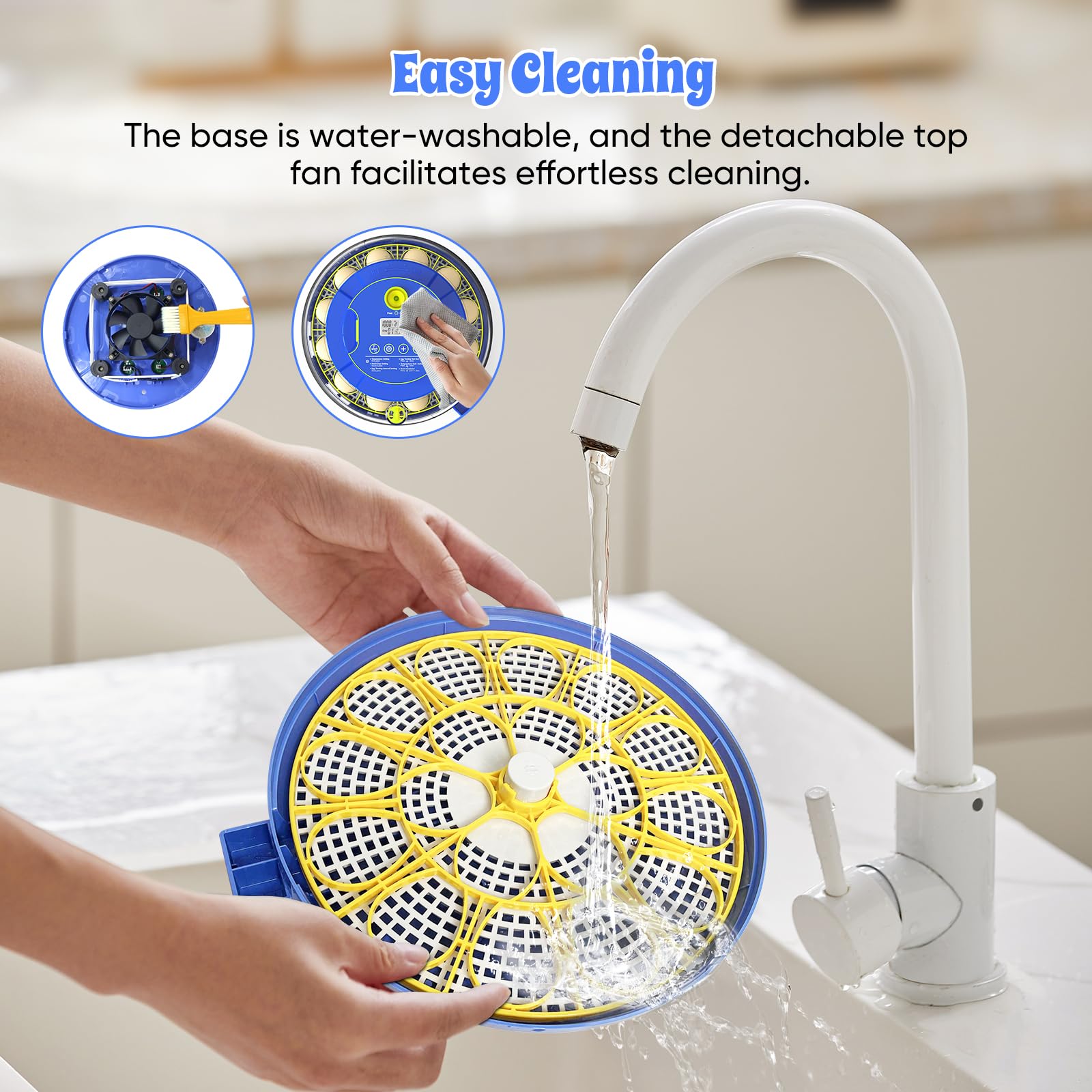 【Durable, Easy-Clean Design】 Made of tough ABS plastic, this chicken incubator has removable trays and a wipeable interior.Please wipe the lid and internal components with a towel; do not wash with water.The base and trays can be washed with water.Simplify cleanup and reuse season