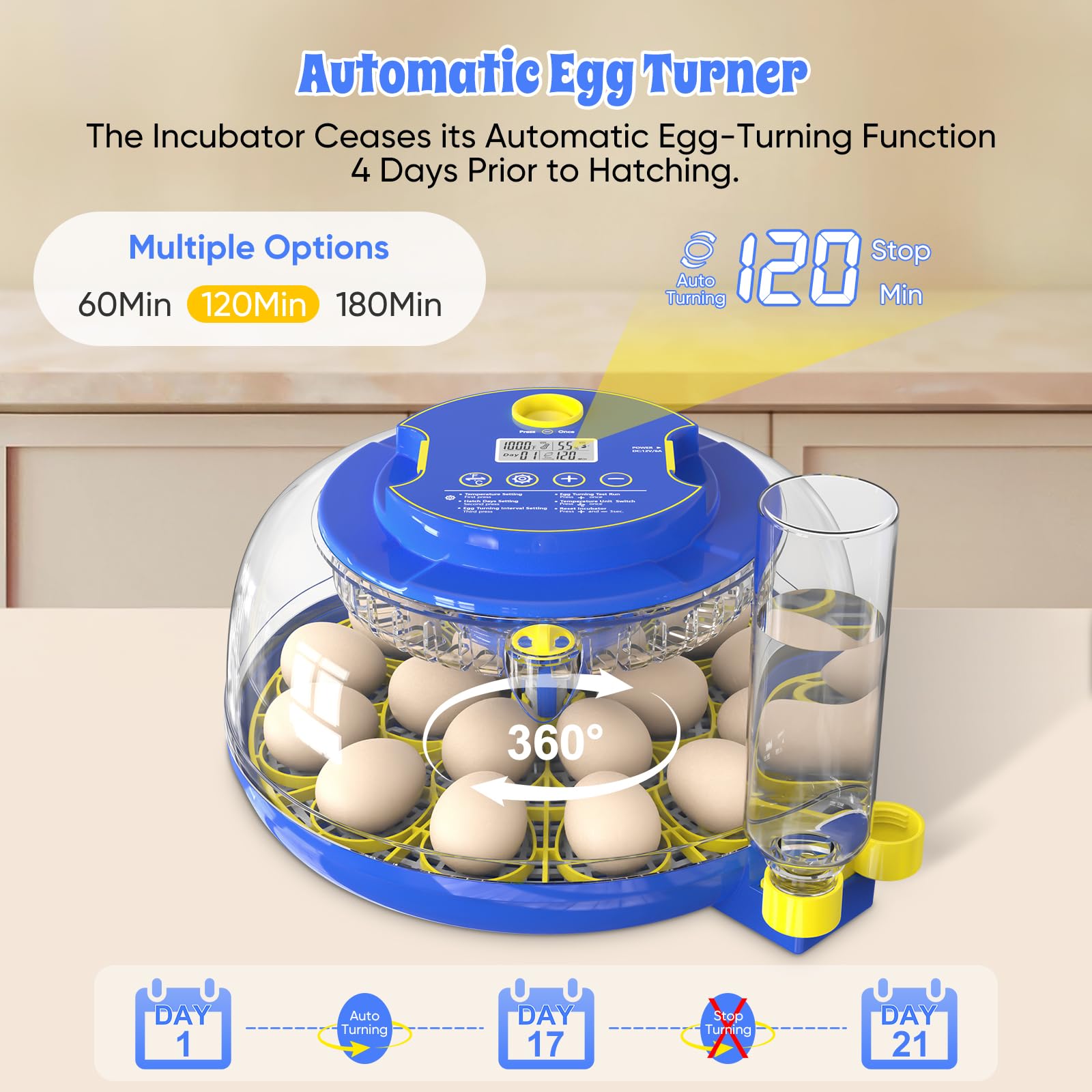 【Smart Auto Egg Turning 】 This egg incubator features automatic egg turning and simulates natural hatching conditions.Adjustable rotation intervals (1/2/3 hours) ensure precise egg turning for healthy embryo development, with auto-stop 4 days before hatching .Perfect for incubators for hatching eggs to boost hatch rates effortlessly.