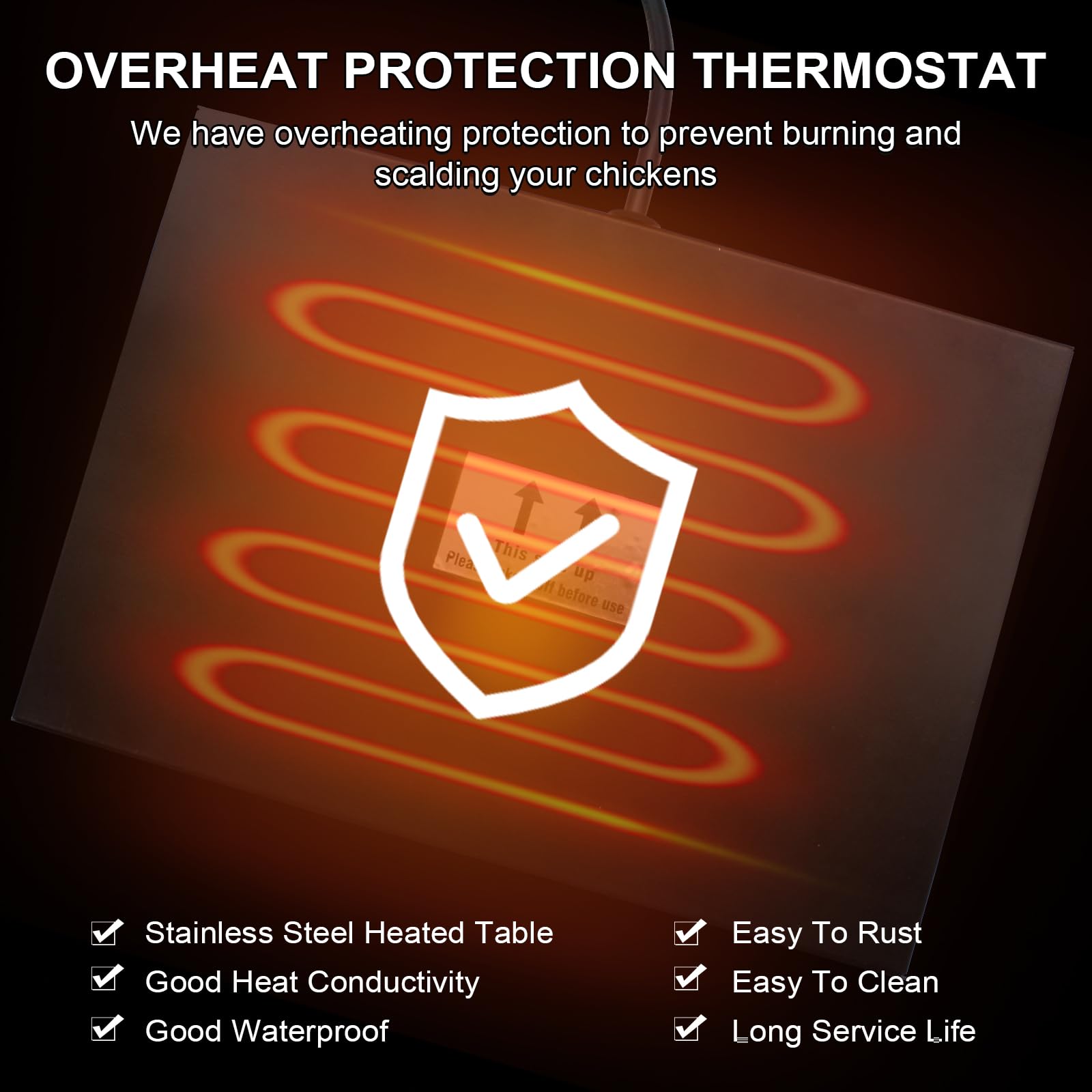 140-167°F CONSTANT TEMPERATURE - GIFANK Heated Poultry Waterer table built-in temperature control chip and overheating protection design, automatic control of heating temperature to 140-167°F, which can effectively solve the problem of overheating and scalding chickens or other small pets, and also avoid the safety problem of chicken coop fire caused by overheating.