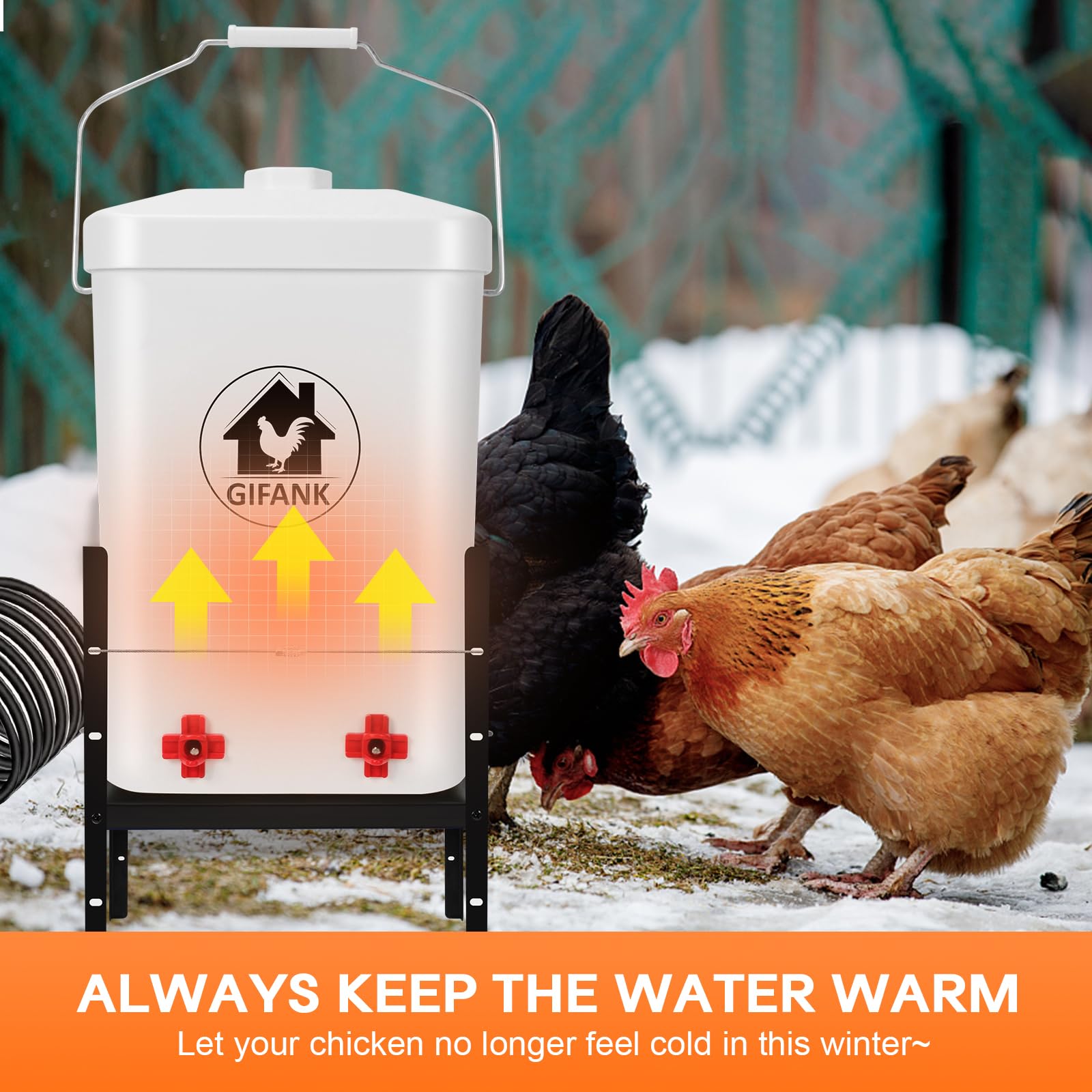 NEW UPGRADES 2 in 1 HEATED CHICKEN WATERER - GIFANK 2-gallon heated Chicken Waterer to prevent the water from freezing due to cold weather and provide poultry drinking warm water. Adopts a split structure with a heated table, which is conducive to water circulation, raises the kettle, and prevents water from being polluted, Keep the water fresh and clean.Available all year round.