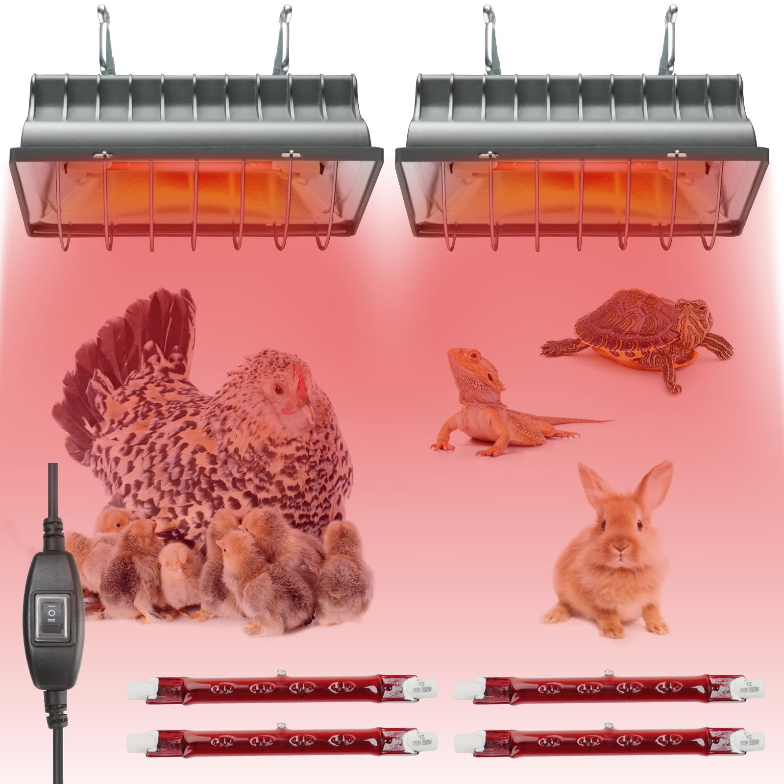 2 Pack 250W Chicken Coop Heater for Chicken Dog Kennel, Cat Bed, Reptiles & Incubators, 2 Heating Mode Warmer for Chicken Coop in Winter, Inside and Outdoor Pet Total 4 Heating Tube as Backup Lamp
