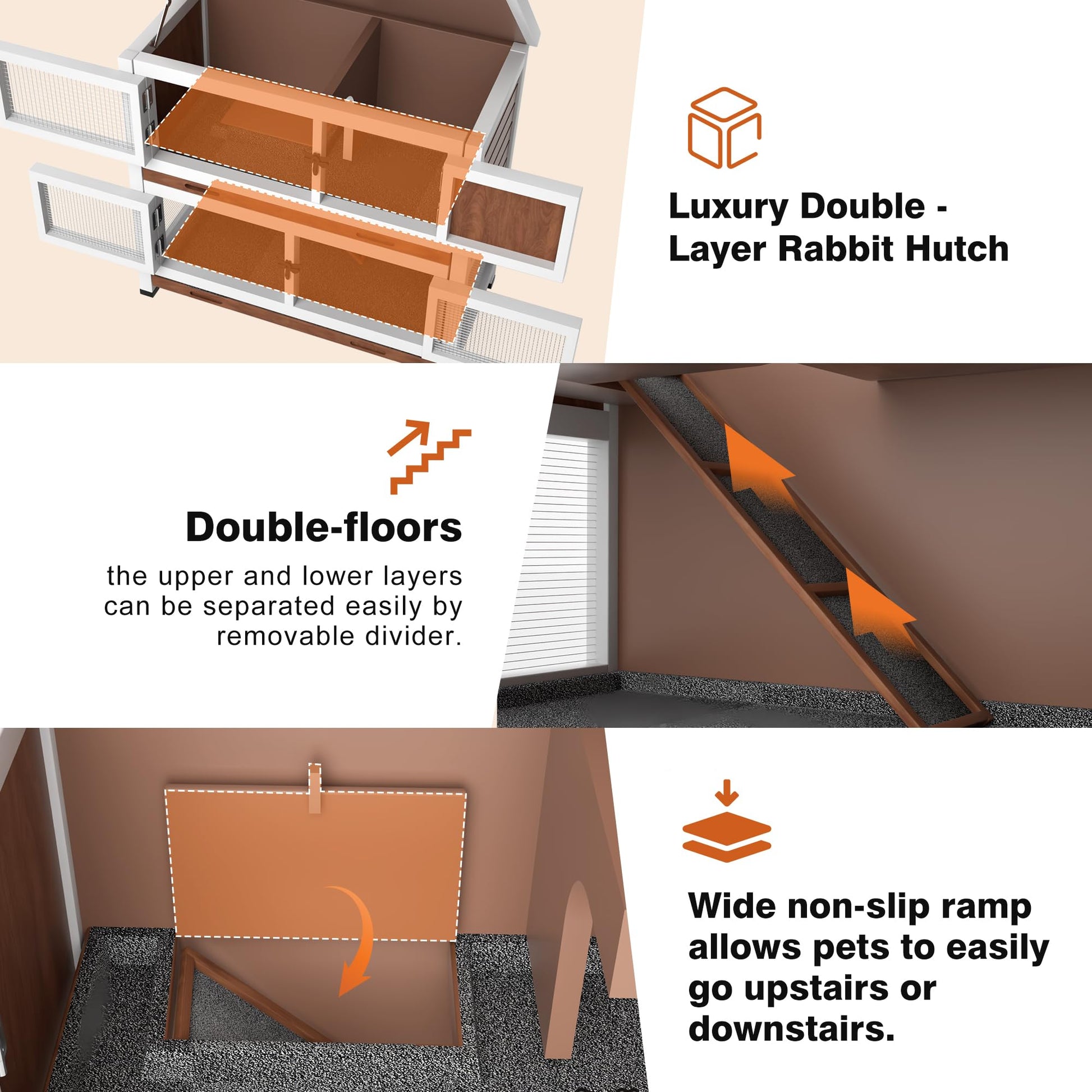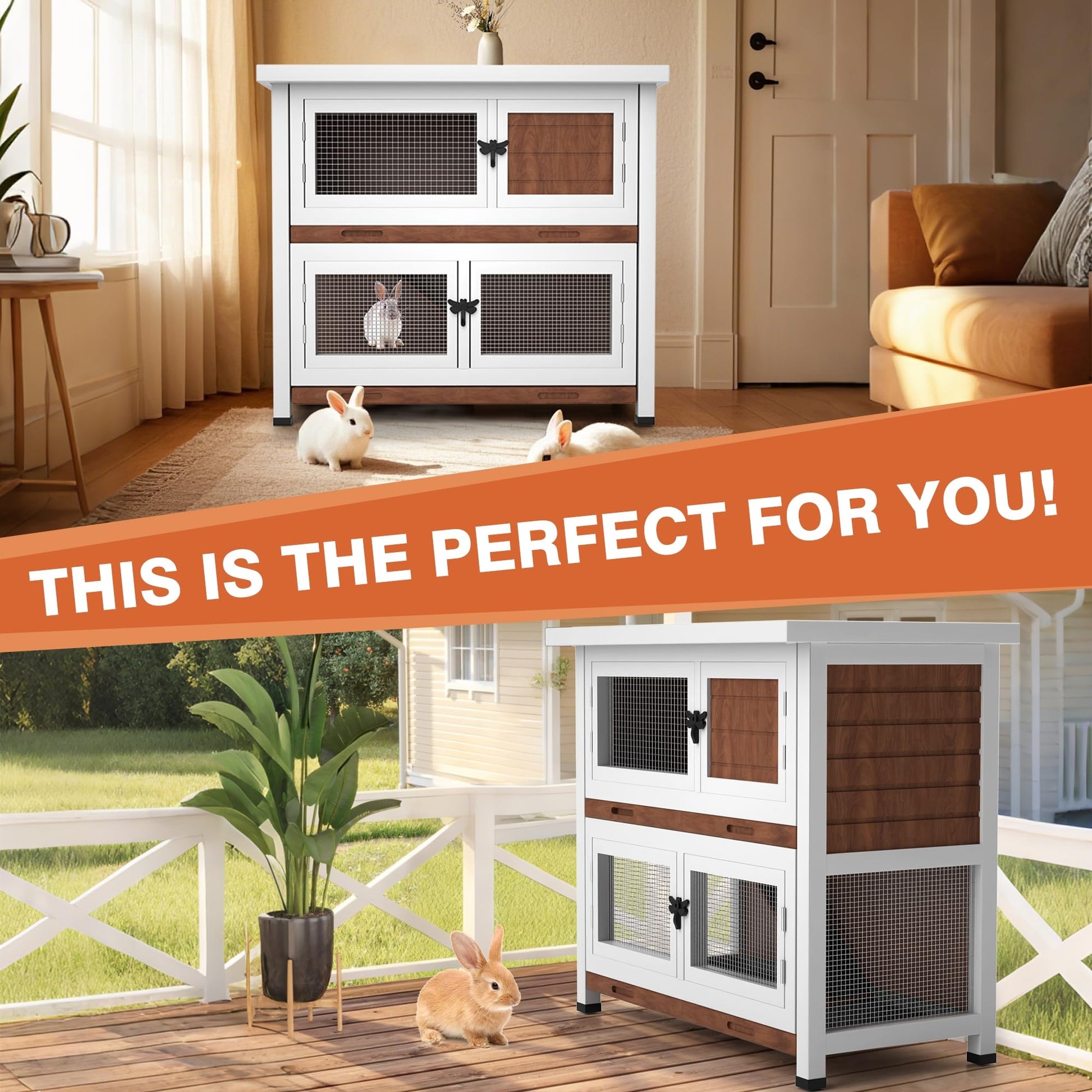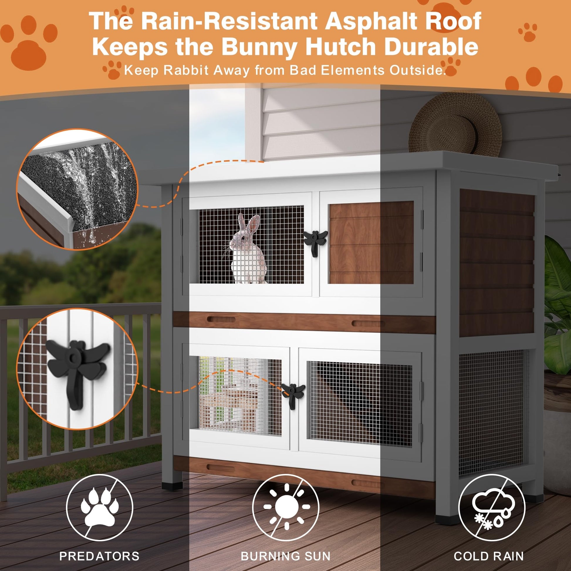 2 Story Rabbit Hutch, Indoor Outdoor Bunny Hutch Solid Wood Rabbit Cage with Removable Trays, Waterproof Asphalt Roofs and Ventilation Door, Small Animal House for Rabbit Guinea Pig Ferret, Walnut