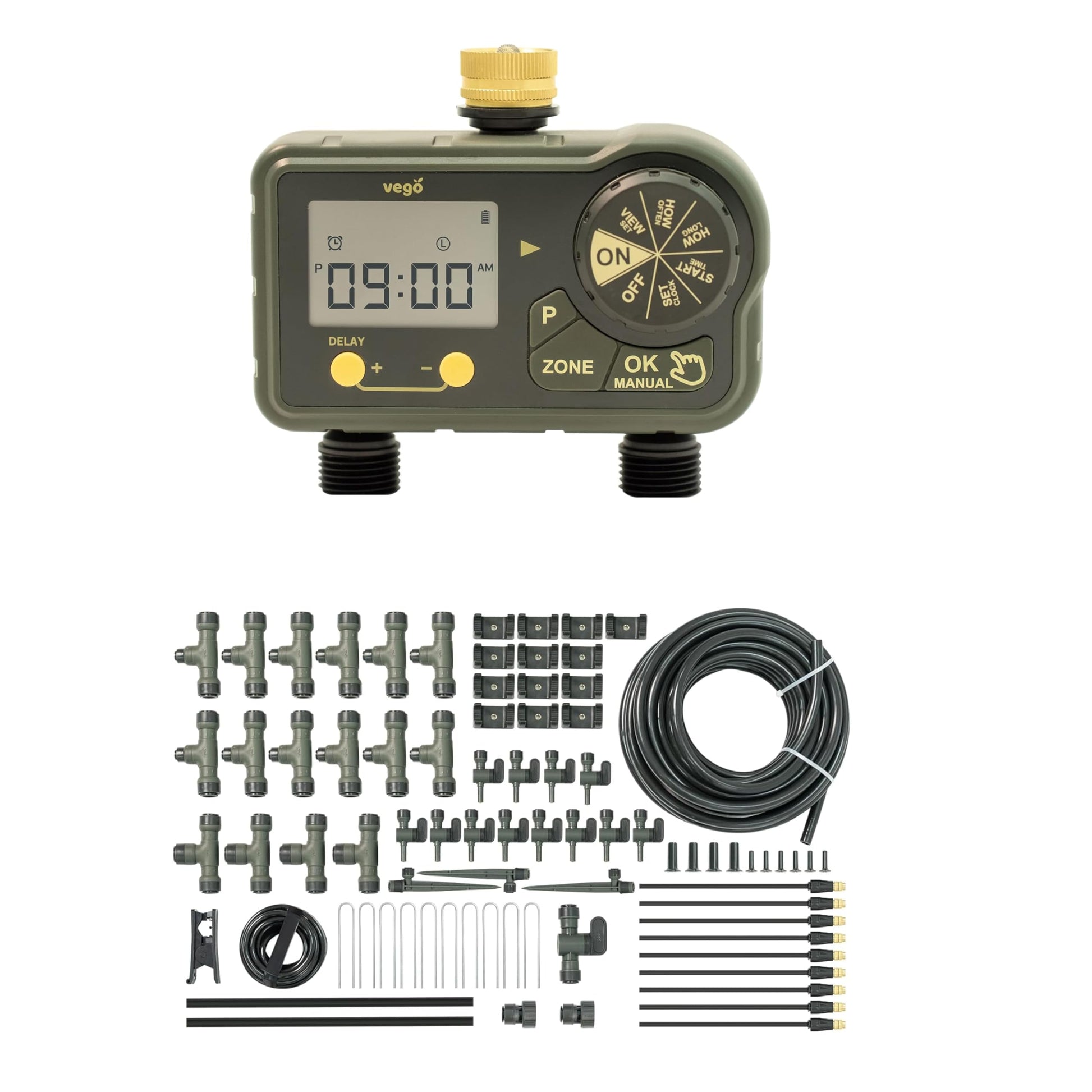 2 Zone Watering Timer with Brass Inlet & 40ft Drip Irrigation System for Raised Garden Beds