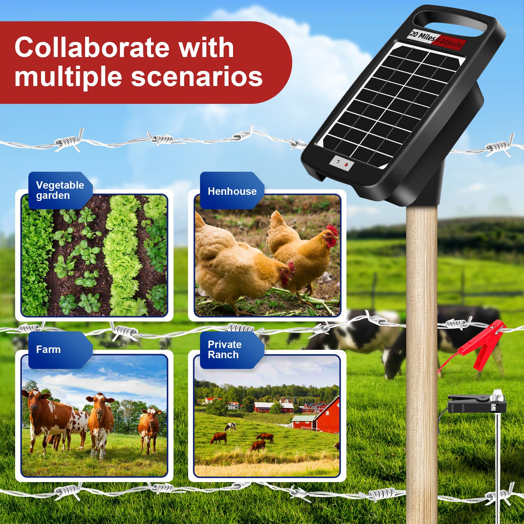 20 Miles Solar Electric Fence Charger,Output 0.32J Electric Fence Charger,24-Hour Uninterrupted Protection Solar Fence Charger,Solar Fence Energizerr That can Work for 14 Days Without Sunlight