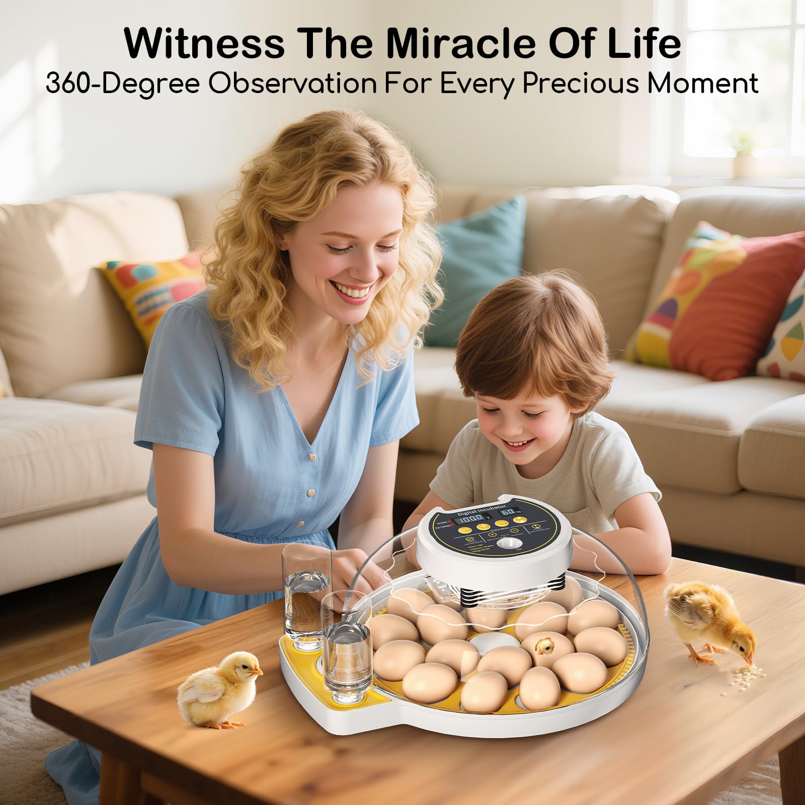 [ Egg Candler Light ] - Equipped with a visual egg candler lighting on top of the egg incubator, convenient to observe the 21-day hatching progress and checking the egg's condition. Covered with a transparent lid for a clear 360° View.