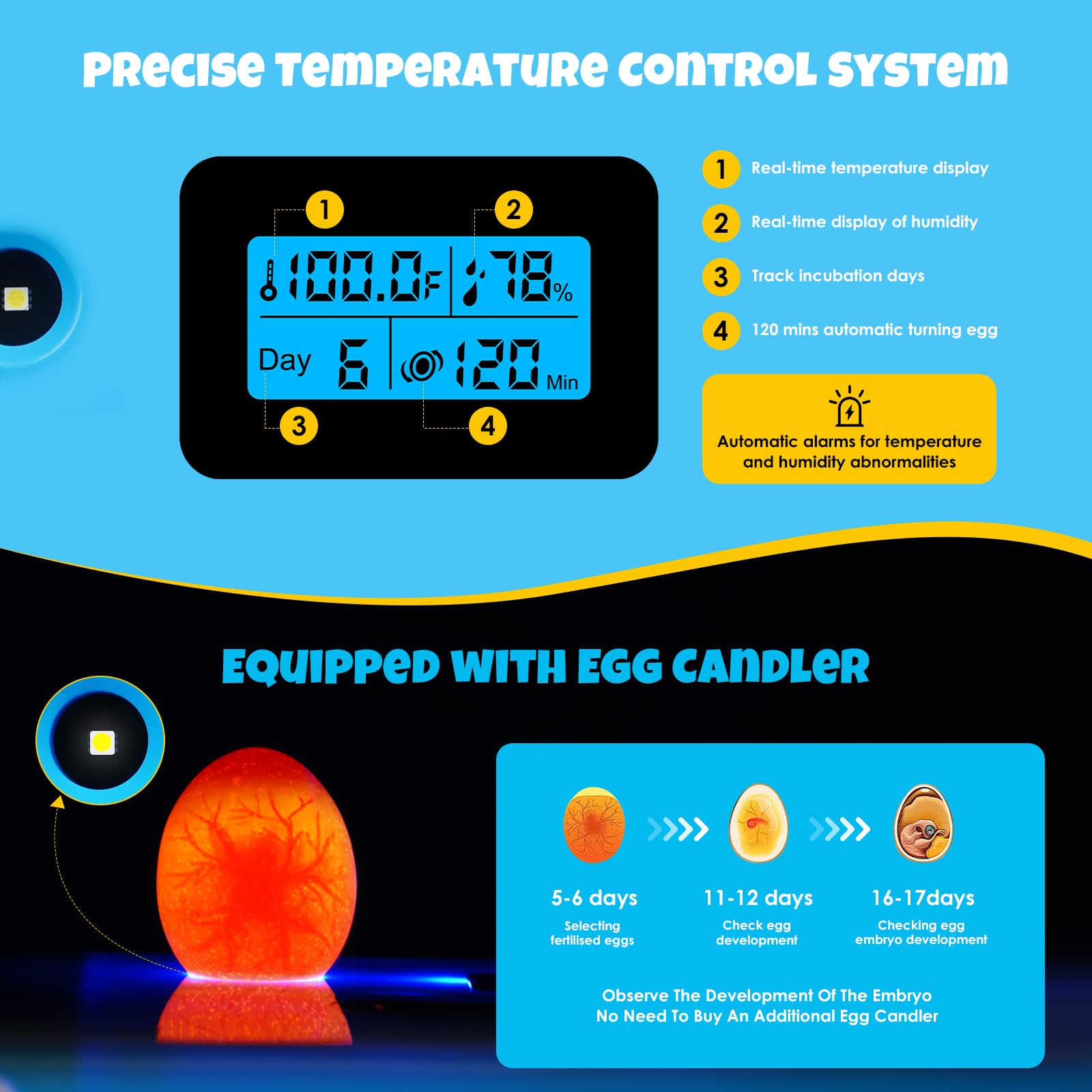 š£Visual Observation: Our incubator features a high-definition egg candler, allowing you to clearly observe the development inside the eggs. This interactive feature enriches your home hatching experience, providing excitement and engagement at every stage of the process.egg incubator with automatic egg turning and humidity control