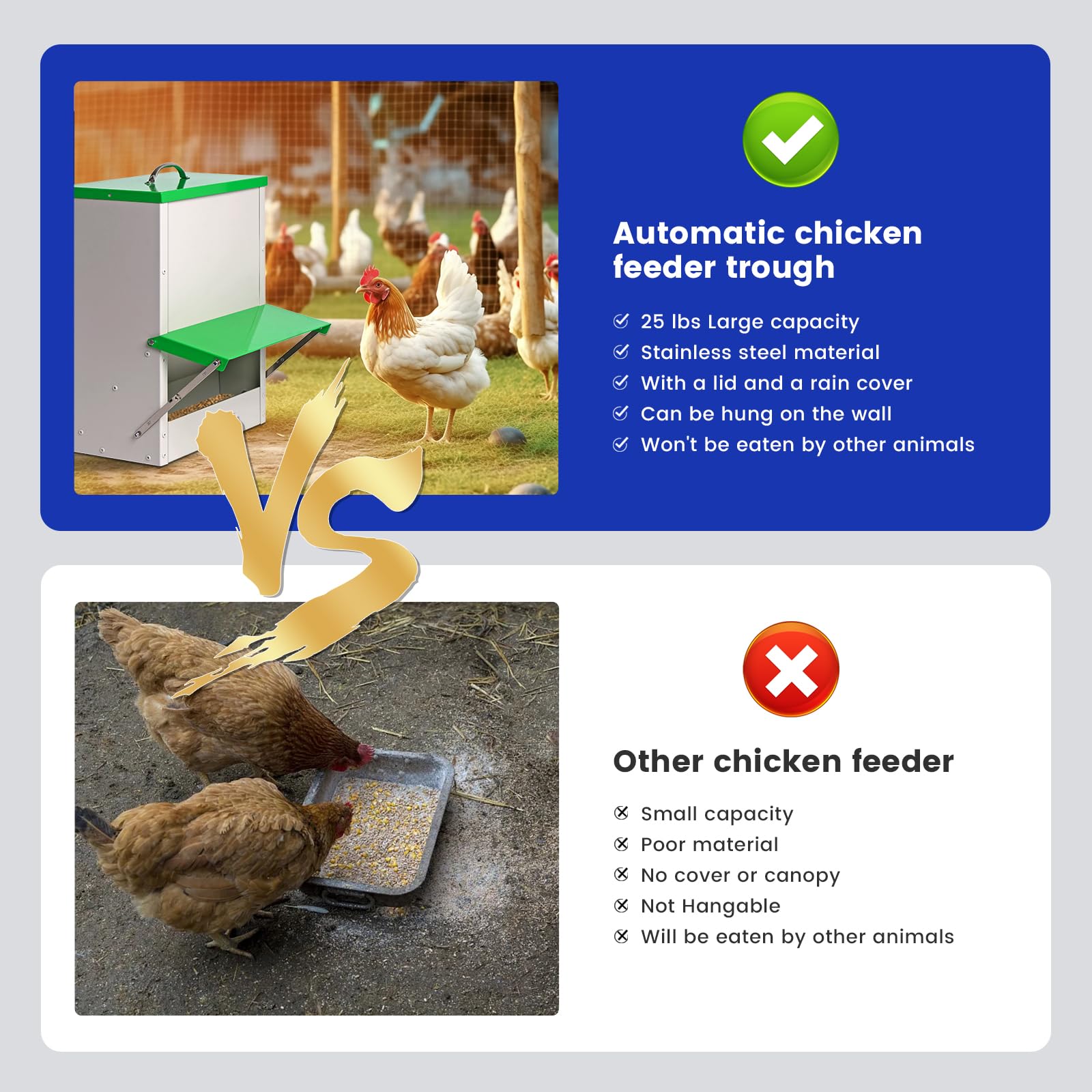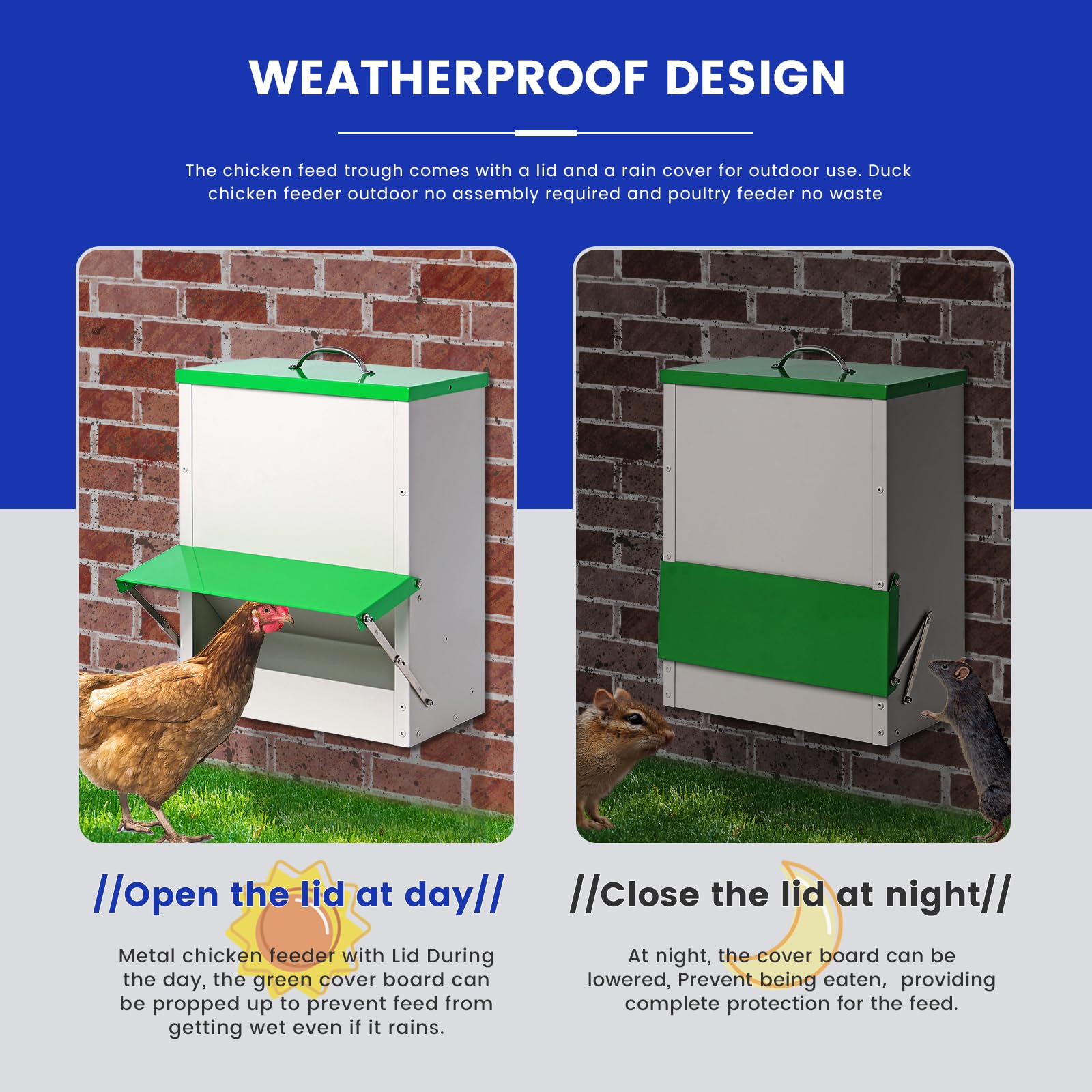 Automatic Chicken Feeder Trough: Auto food dispenser,stainless steel metal chicken feed trough, waterproof sturdy and durable. The chicken feed trough comes with a lid and a rain cover for outdoor use. Duck chicken feeder outdoor no assembly required and poultry feeder no waste