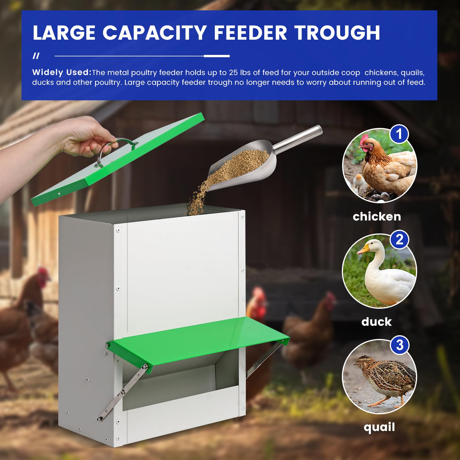 Widely Used:The metal poultry feeder holds up to 25 lbs of feed for your outside coop chickens, quails, ducks and other poultry. Large capacity feeder trough no longer needs to worry about running out of feed