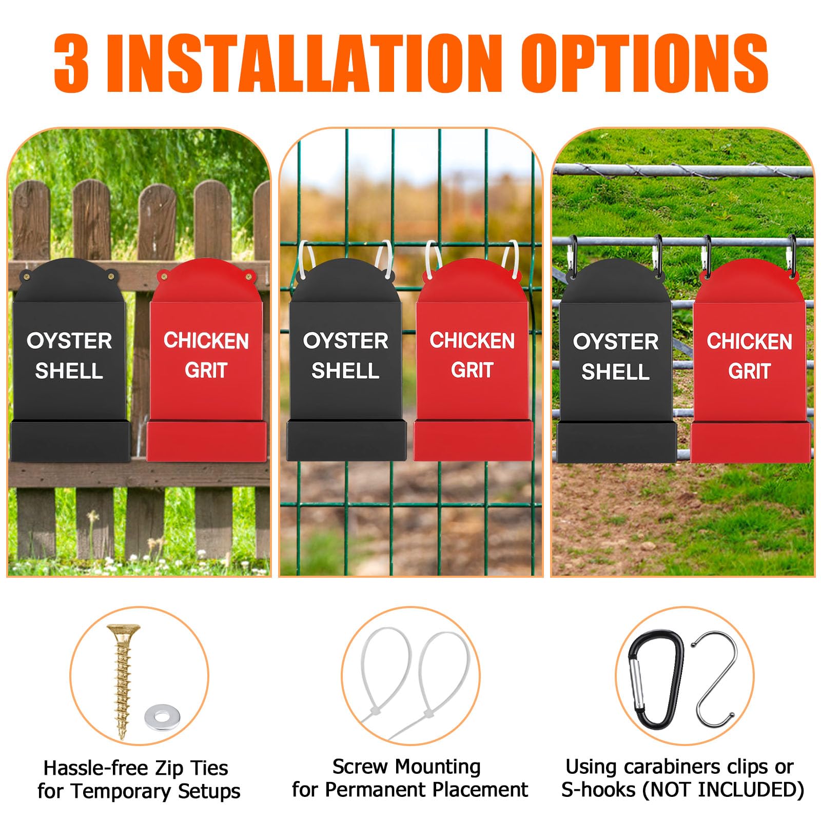 【Easy-Fill & Low-Maintenance】-- The wide-mouth opening allows for quick refills, while the smooth surface makes cleaning a breeze. No more stuck-on debris, just wipe or rinse to maintain hygiene. This feeder offers two simple methods -- mount it with screws or secure it with zip ties (all necessary hardware is included to suit your needs). Also, can be hung securely with carabiners clips or S-hooks if you prepare yourself with these parts