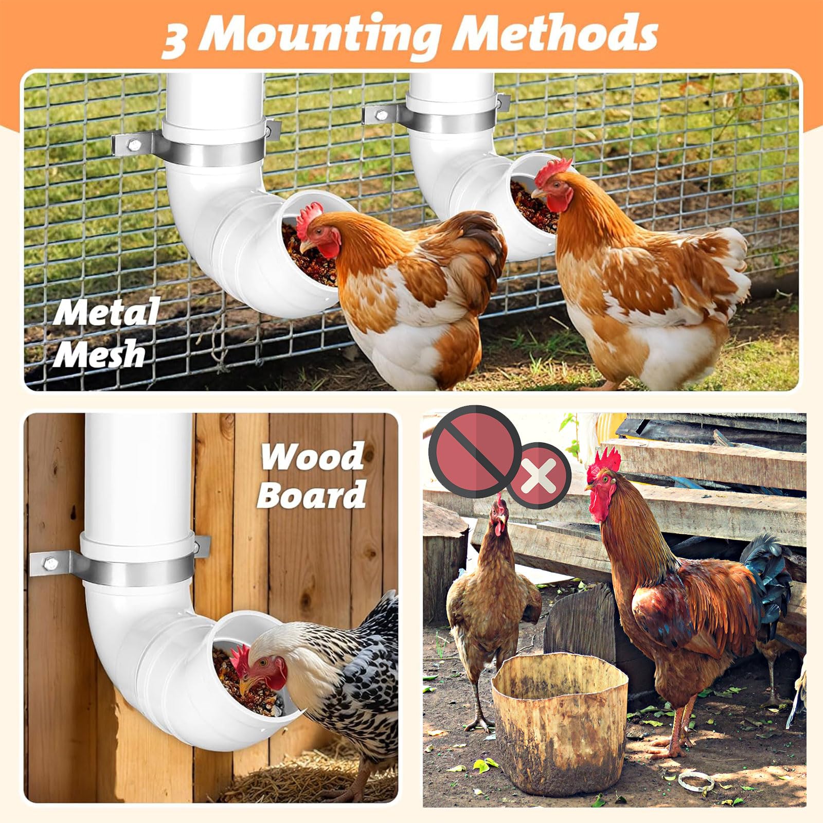 【Versatile Installation Options】The Chicken Feeder Can Be Mounted On Walls, Wooden Boards, Or Mesh Surfaces, Providing Flexibility In Installation. It Comes With High-Strength Upgraded Connect Hoops To Ensure Stability. Make Sure To Place The Feeder Away From Rain And Water Sources To Prevent Plastic Corrosion