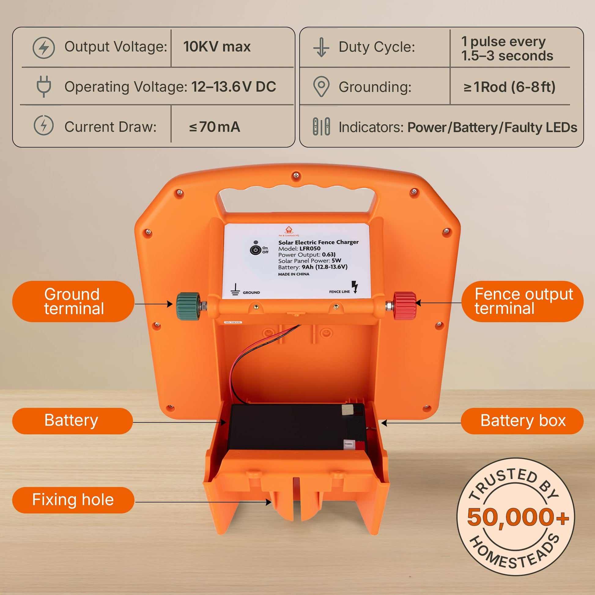 Reliable battery and solar panel: With an advanced solar panel featuring enhanced battery management, you can count on consistent power even in low-light conditions to electrify your perimeter. Install the solar-powered fence charger and rest assured with reliable power for up to 25 days, thanks to the robust 13.6V/12AH battery.