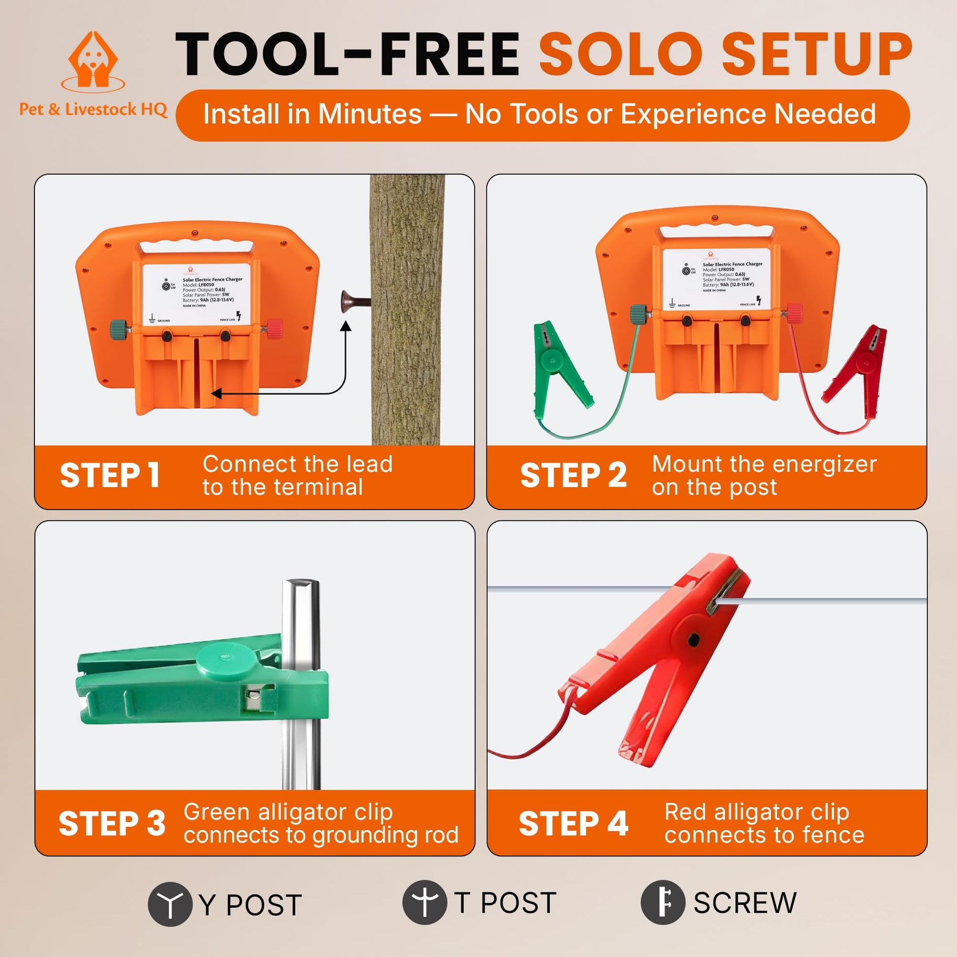 Solar Powered Electric Fence Kit: The solar fence charger for livestock features a 360-degree rotation capability, enabling it to pivot smoothly on T-posts to align with the sunlight throughout the day. This ensures optimal exposure to sunlight, maximizing solar energy absorption and enhancing the charger's efficiency in powering your electric fence system.
