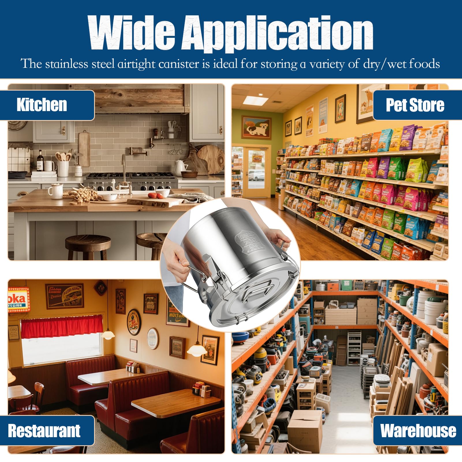 Versatile Storage: Our stainless steel food storage containers has a large capacity of 3.17gallon (12L). The stainless steel container is ideal for storage and can hold a variety of dry goods, such as flour, sugar, rice, noodles, grains, coffee beans, birdseed, pet food, etc. It is the perfect choice for sealed storage. It can also be used as a pet food storage container