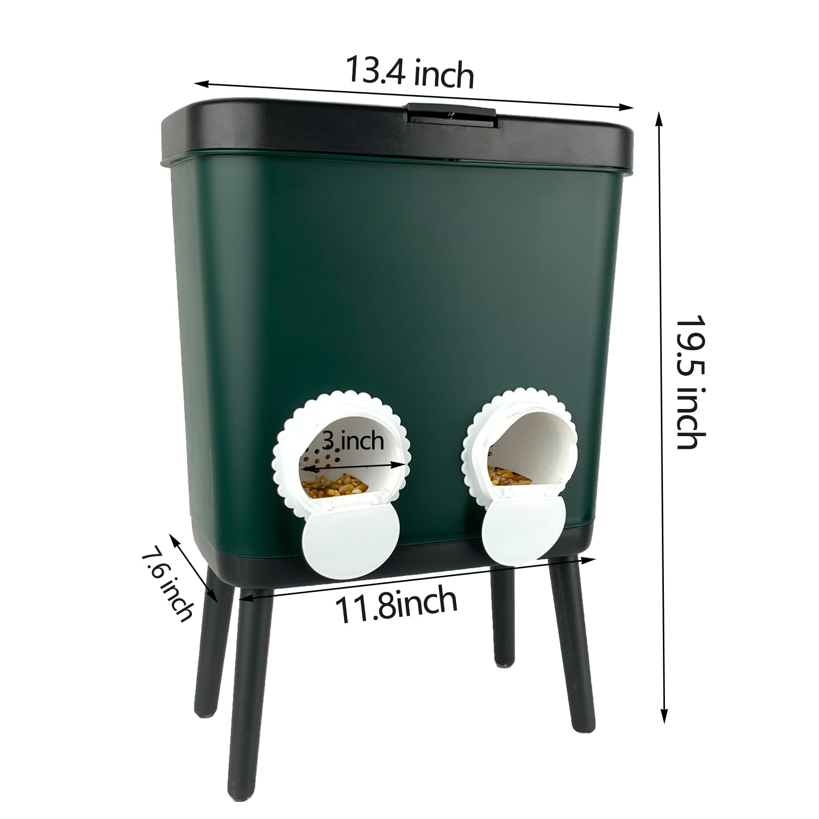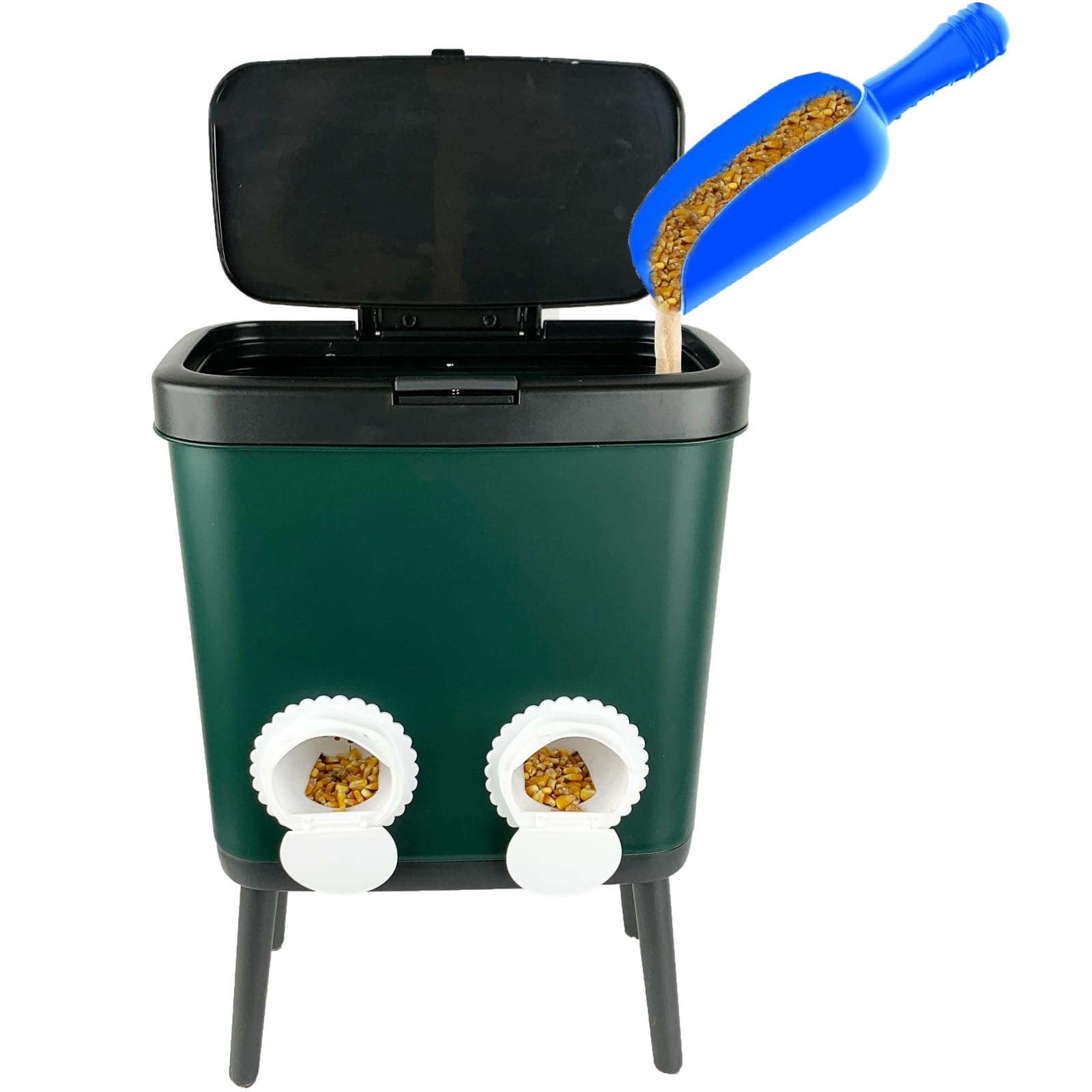 Free-Standing and Press to Open Lid: Our chicken food feeder with 4 legs is free-standing, so that the 4pcs ports have a certain height from the ground, adapting to the chicken's feeding requirements, avoiding chicken owners to pad bricks at the bottom of the feeder to increase the height, saving time and labor.Press-on chicken water dispenser lid keeps the food feed dry in the feed bucket.