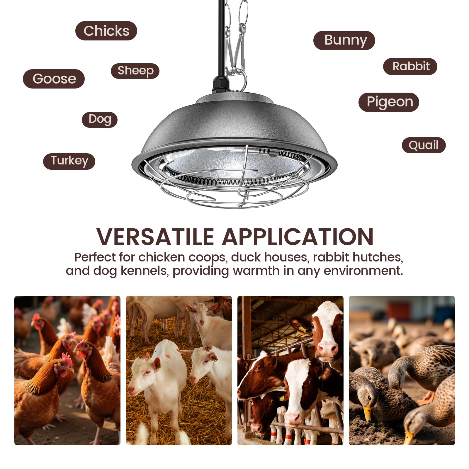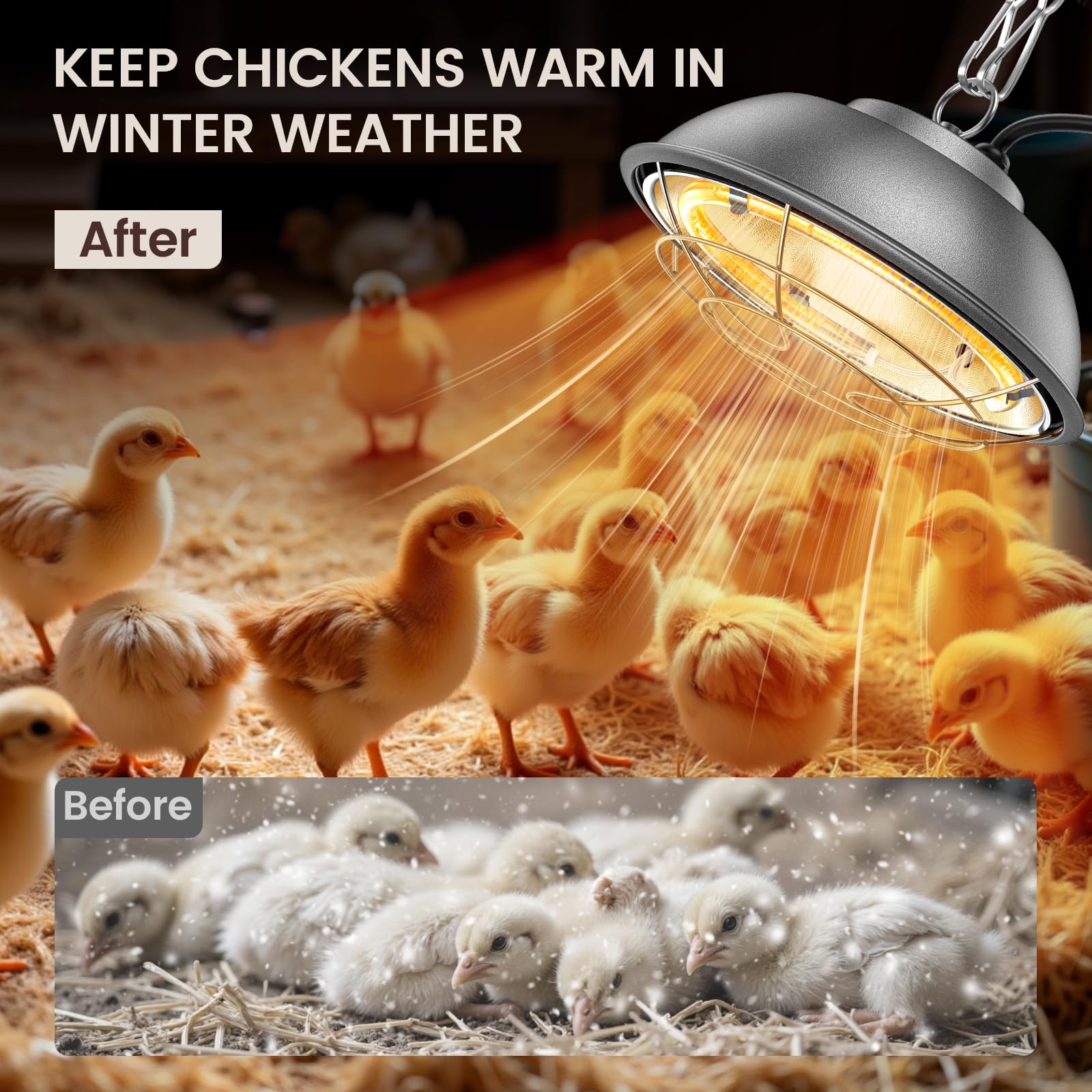 Weather-Resistant Design: This chicken coop heat lamp built with all-aluminum alloy cover, offering superior durability and protection; Its waterproof design ensures reliable performance, even under harsh environmental conditions