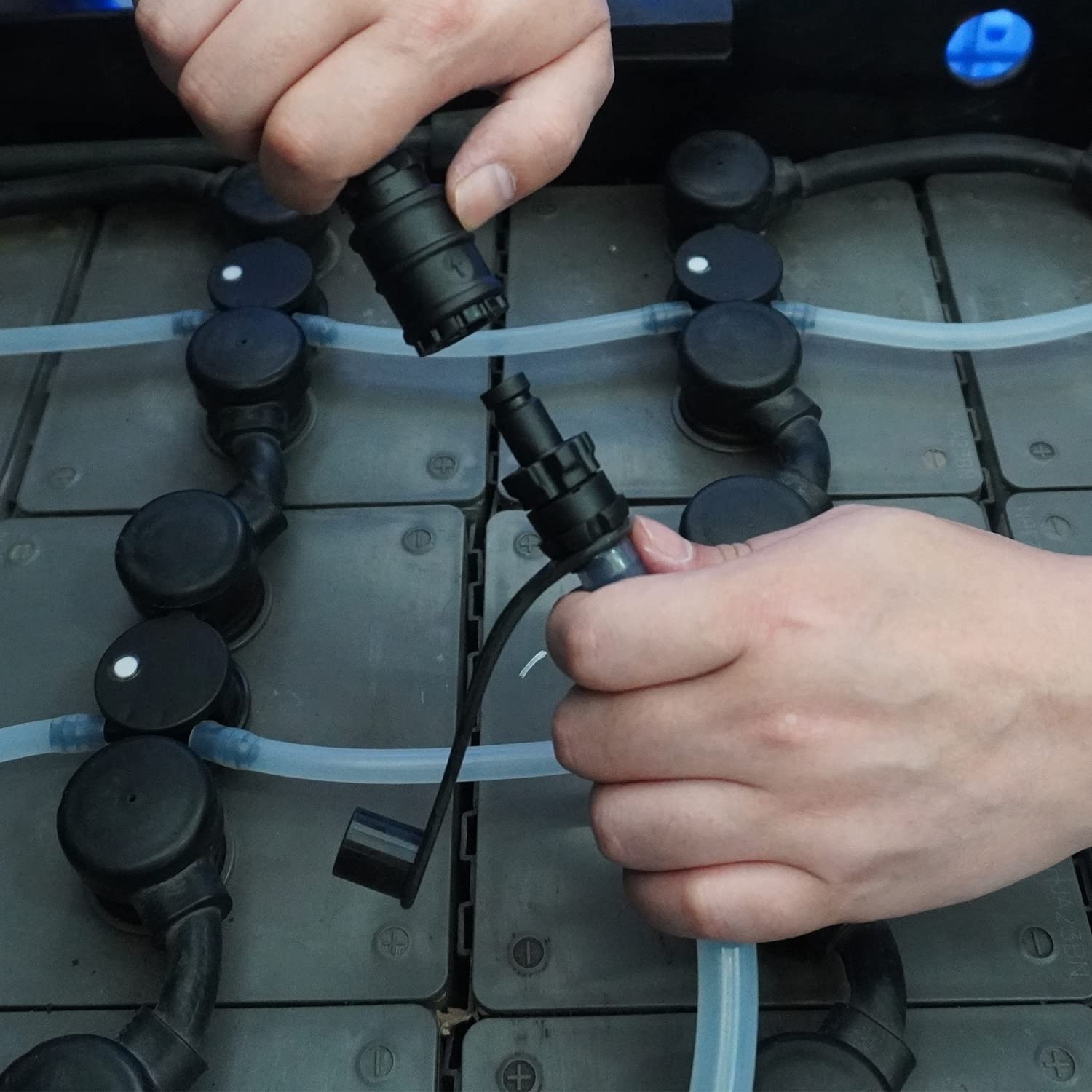 All battery watering systems are equipped with self-regulating valves that are assembled with clear tubing. Pairing the quick connects allows water to flow through the tubing and into the valves, filling each cell with the precise amount of water