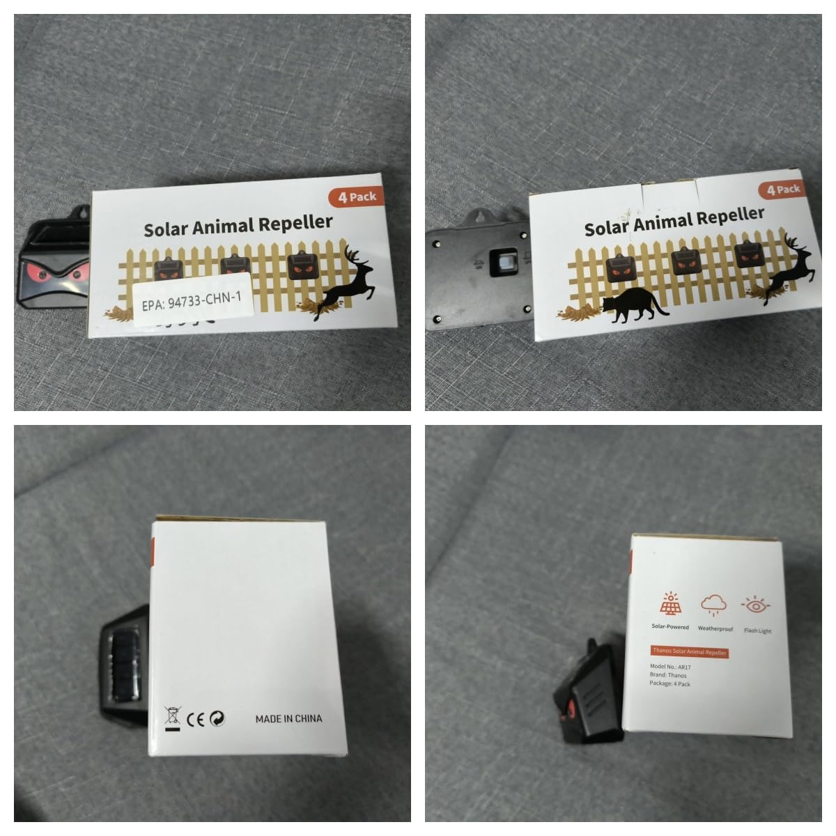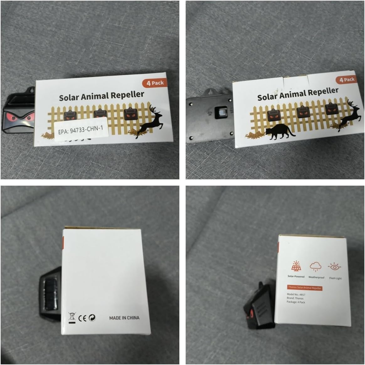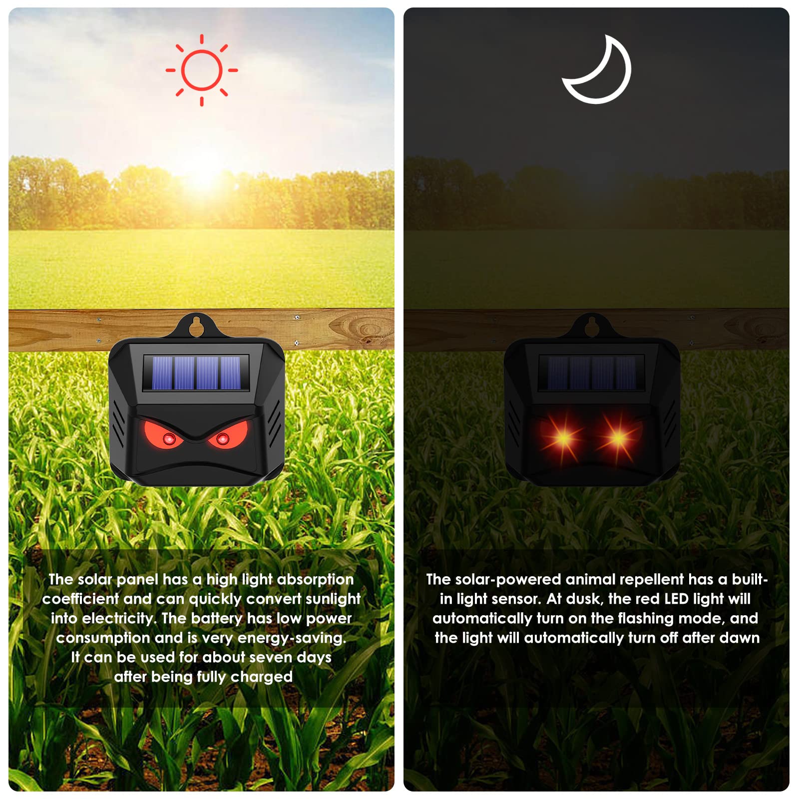 Solar Powered Animal Repellent Outdoor: Equipped with a built-in rechargeable battery and high-efficiency solar panel, predator repellent absorbs sunlight quickly and converts it into energy. With low power consumption, deer repellent light operates for up to seven days on a full charge