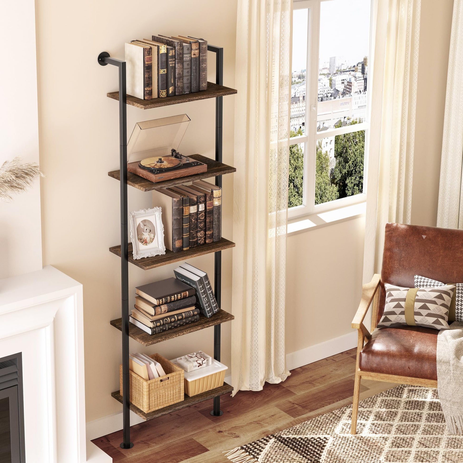 【Timeless Vintage Appeal】Featuring a black metal frame and rustic brown wood grain panels, this ladder bookshelf exudes a timeless vintage elegance. It adds a touch of sophistication to your home decor, creating a warm and natural atmosphere. The leaning design adds a unique charm to your living space.
