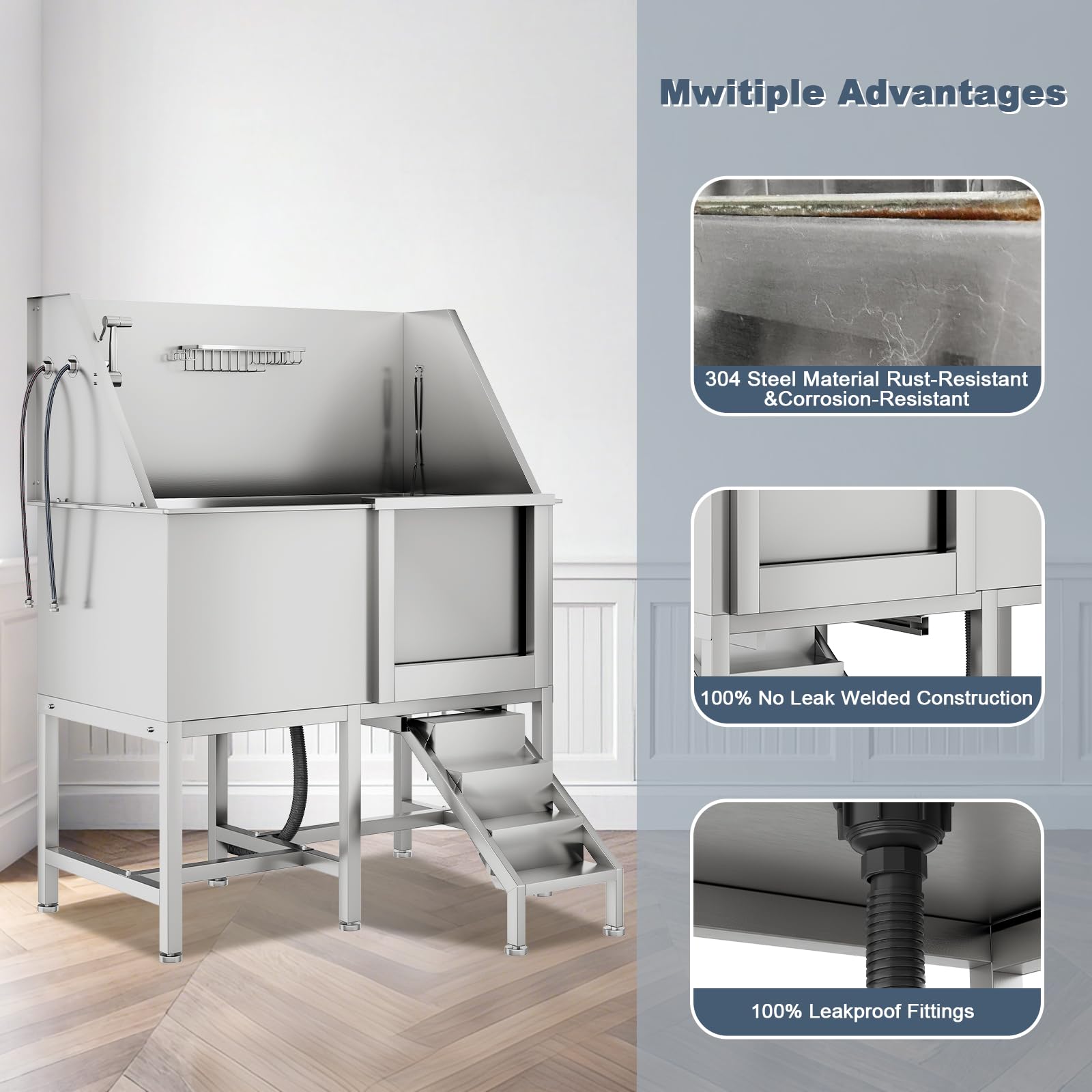 Leak-Proof, Durable & Easy to Install: Crafted from high-grade stainless steel with seamless welding and triple-sealed doors, the Dog Bathtub guarantees 100% leak protection and exceptional rust resistance—perfect for frequent use at home or in professional grooming salons. It supports pets up to 330 lbs and features a hassle-free design: even users without technical skills can assemble it quickly.