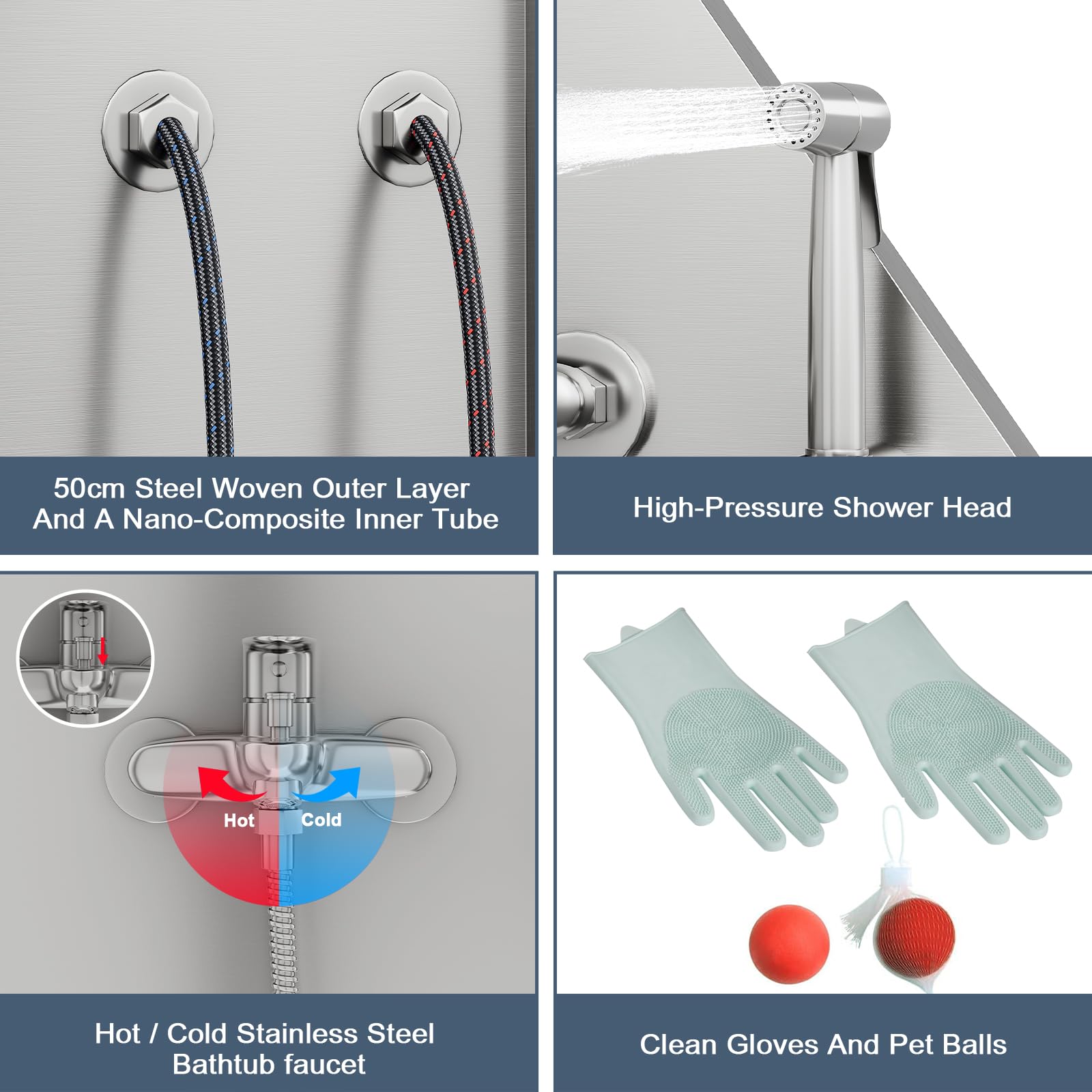 Ergonomic Comfort & Efficient Grooming Tools: Designed to ease strain on you and speed up baths: the tub’s ergonomic height eliminates bending or kneeling, while the 60-inch long shower hose and elevated hot/cold water faucet let you reach every spot (from tiny cats to large dogs) with ease. It also includes a high-pressure multi-function faucet for thorough cleaning, a stainless steel shampoo rack, and a soap holder—keeping all grooming basics organized.