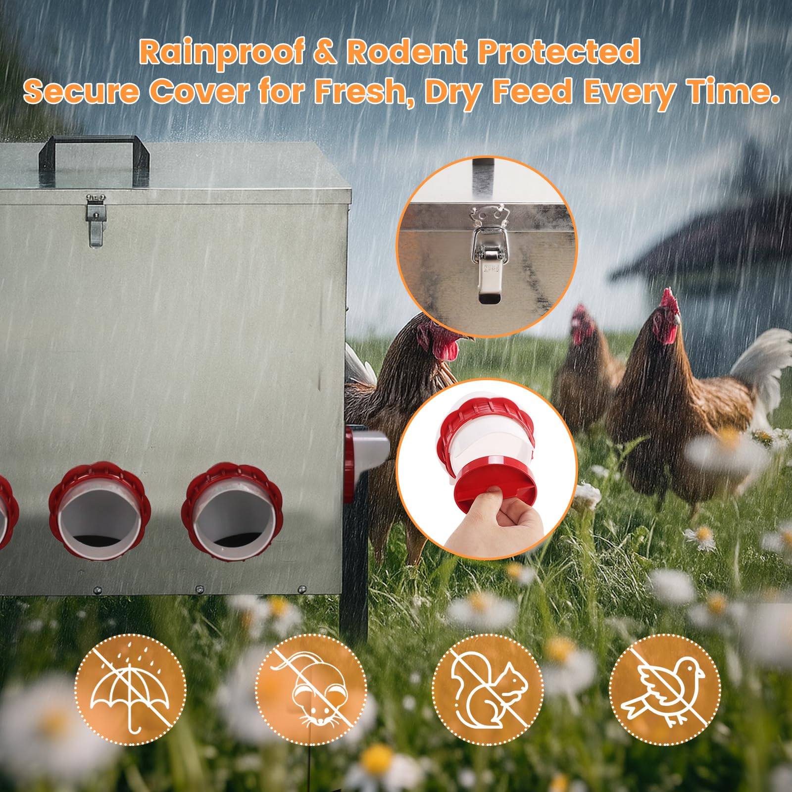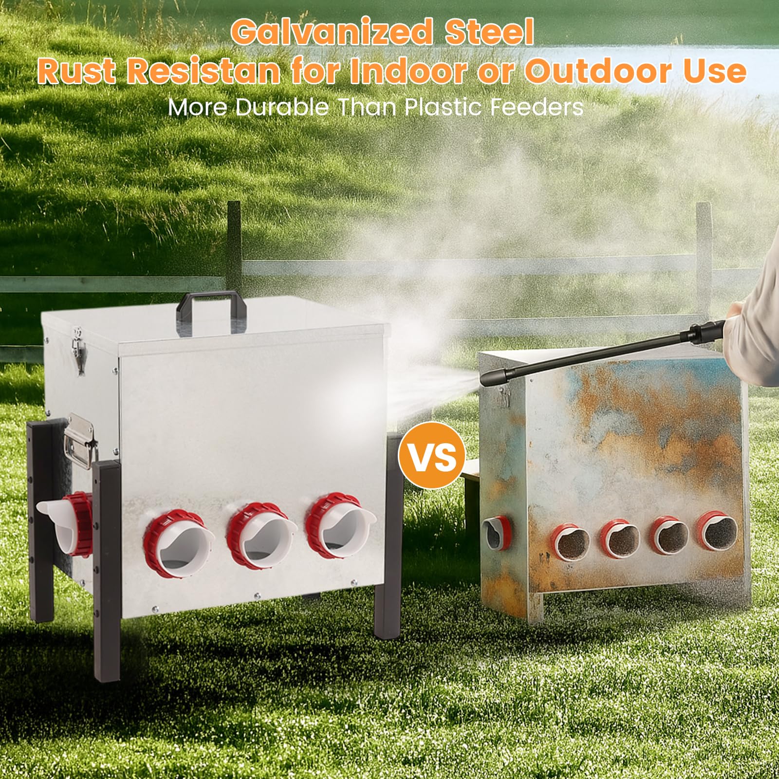 DURABLE & RUST-PROOF BUILD -- Crafted with galvanized metal feed bins and rust-resistant coated iron legs, this outdoor chicken feeder keeps lightweight while withstands harsh weather. Feeding ports add lightweight durability, while the smooth surface ensures easy cleaning. Built to last!