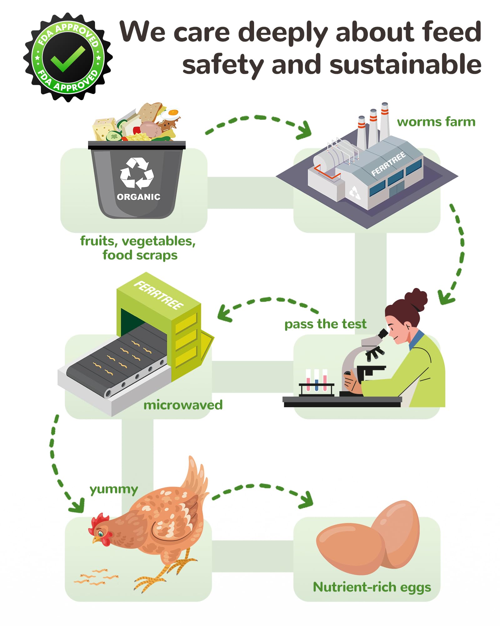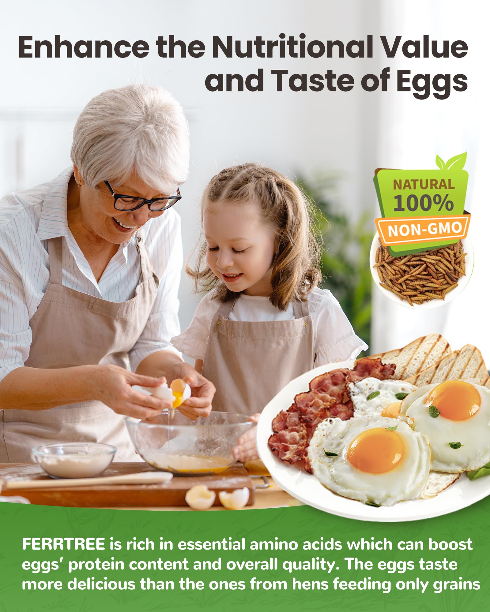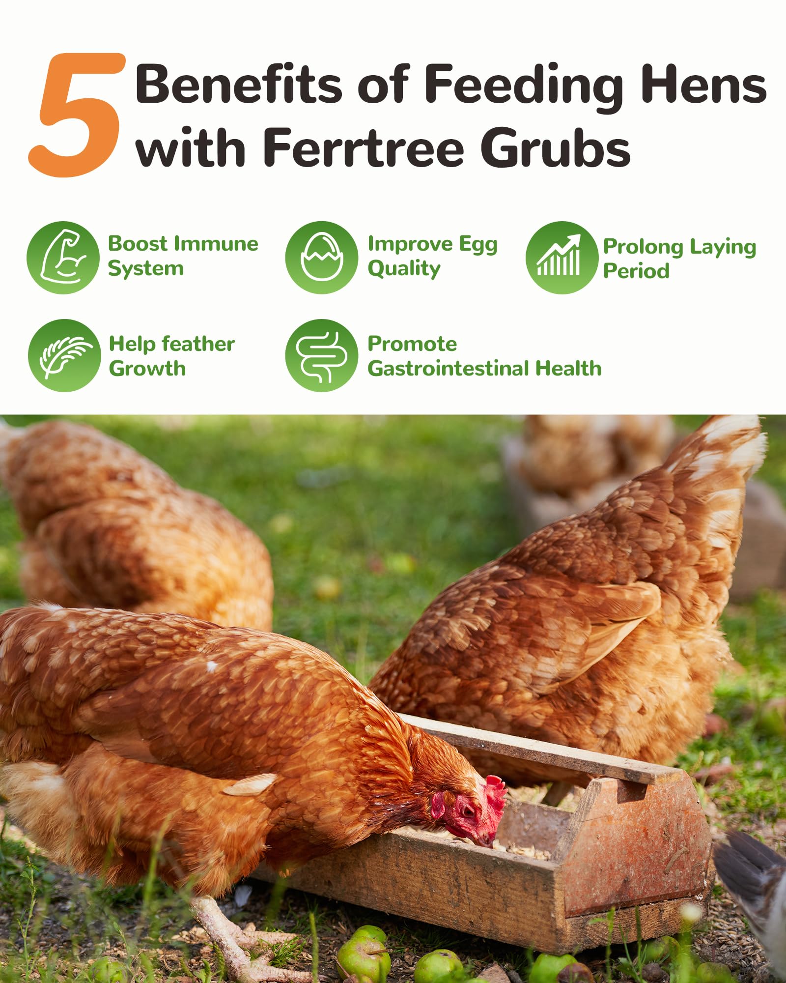 FERRTREE premium black soldier fly larvae are carefully selected for size and nutritional quality. Quick-dried to preserve their crispy texture and delightful aroma, these larvae provide a delicious snack that your chickens will love. Your flock will come running for this tasty treat!