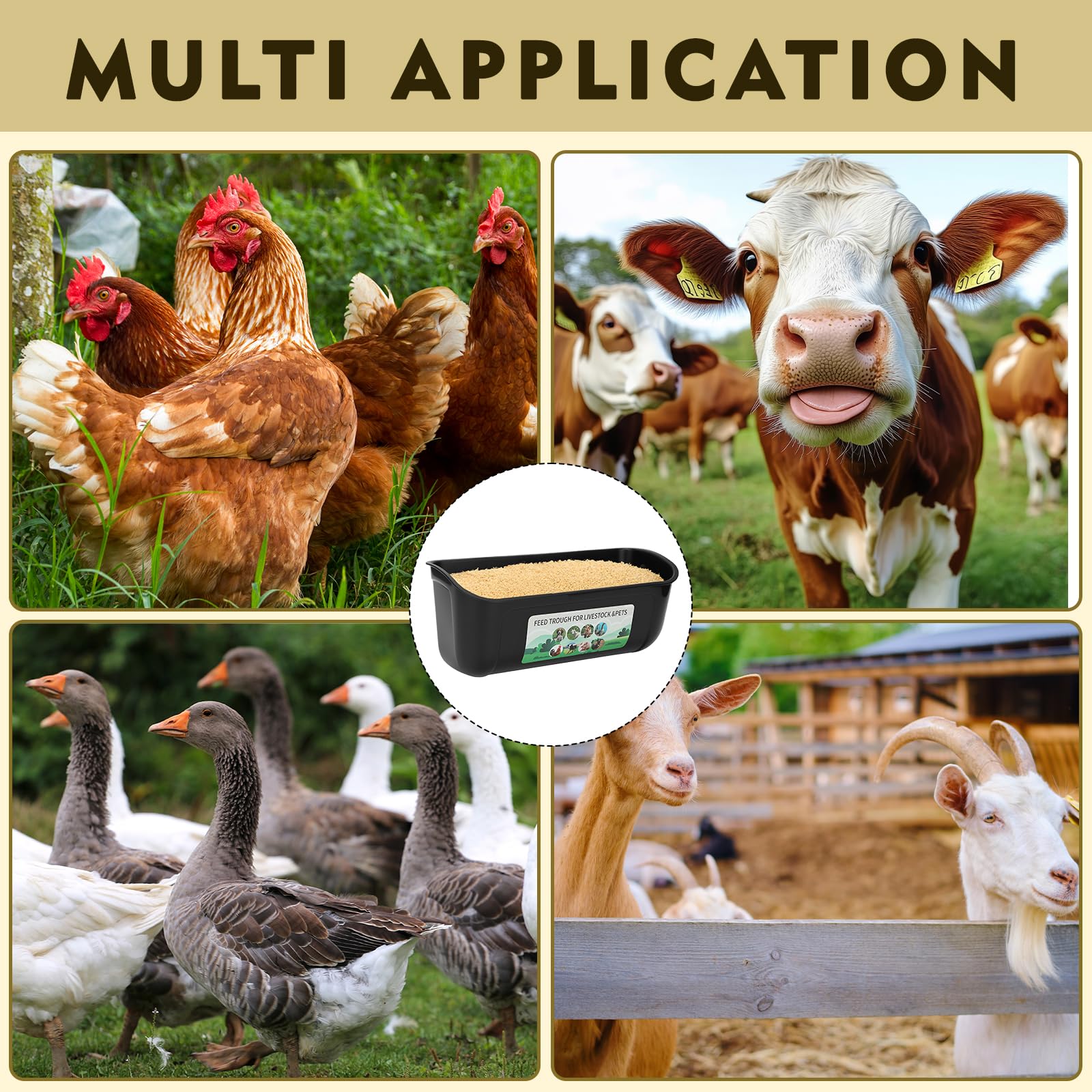Multi-scenario Application: The hanging troughs can meet the needs of various livestock, including goats, sheep, cattle, deer, pigs, chickens, ducks, geese, turkeys, ponies, and even dogs. This innovative feeding solution not only serves as a feeder but also functions as a water dispenser, ensuring that feed and water remain fresh and dry, thus promoting optimal health for the animals.