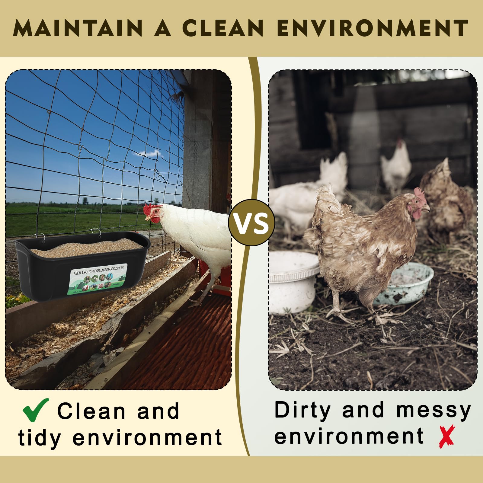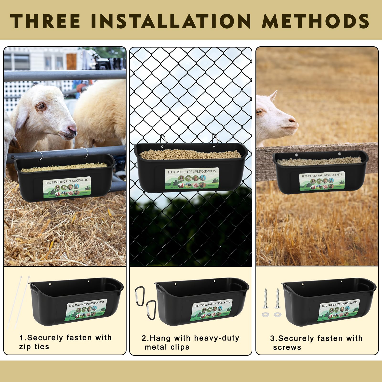 Easy Assembly: Each set of troughs comes with three installation options, whether hanging on wire fencing or mounted on fences and walls, adapting to various settings. You can easily adjust the feeding troughs according to their specific needs.