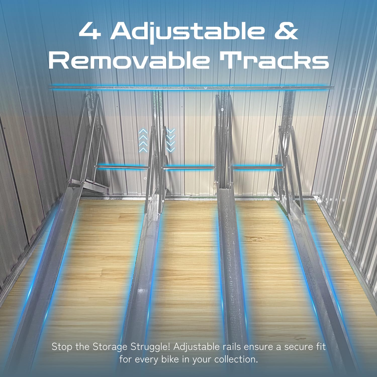 [Smart & Versatile Storage] This efficient 4-track bicycle storage shed system (79x74x63in) says goodbye to bike clutter! It neatly holds up to 4 bikes of any size thanks to adjustable, detachable tracks. Plus, easily convert this bike storage shed into an outdoor storage shed for ultimate flexibility as a bike storage shed