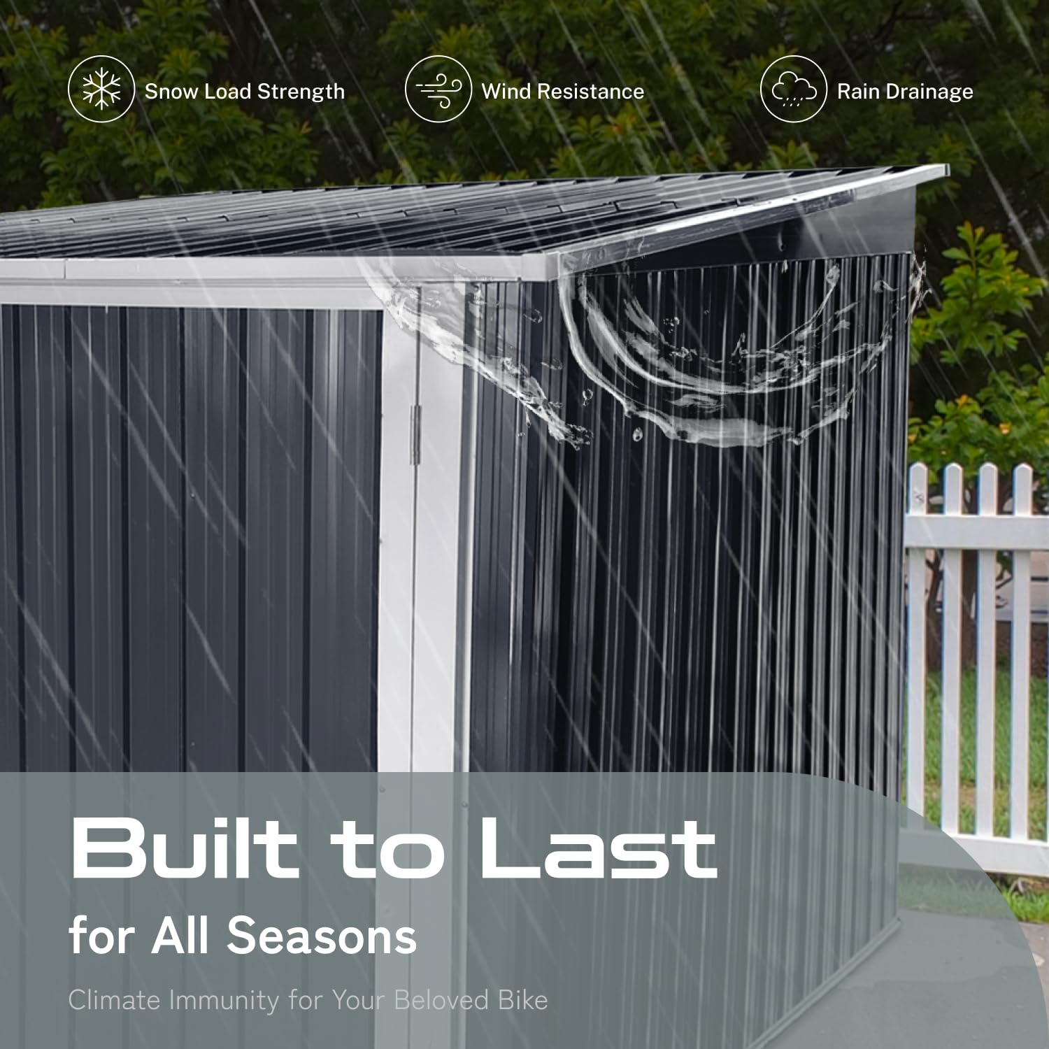 [All-Weather Guardian] Crafted with UV-resistant materials and a grooved roof for rapid drainage, this bike storage shed defies harsh weather. Endures 110 mph winds (Category 2) and 50 lbs/sq ft snow loads, safeguarding your investment for 10 years as a sturdy bicycle storage shed