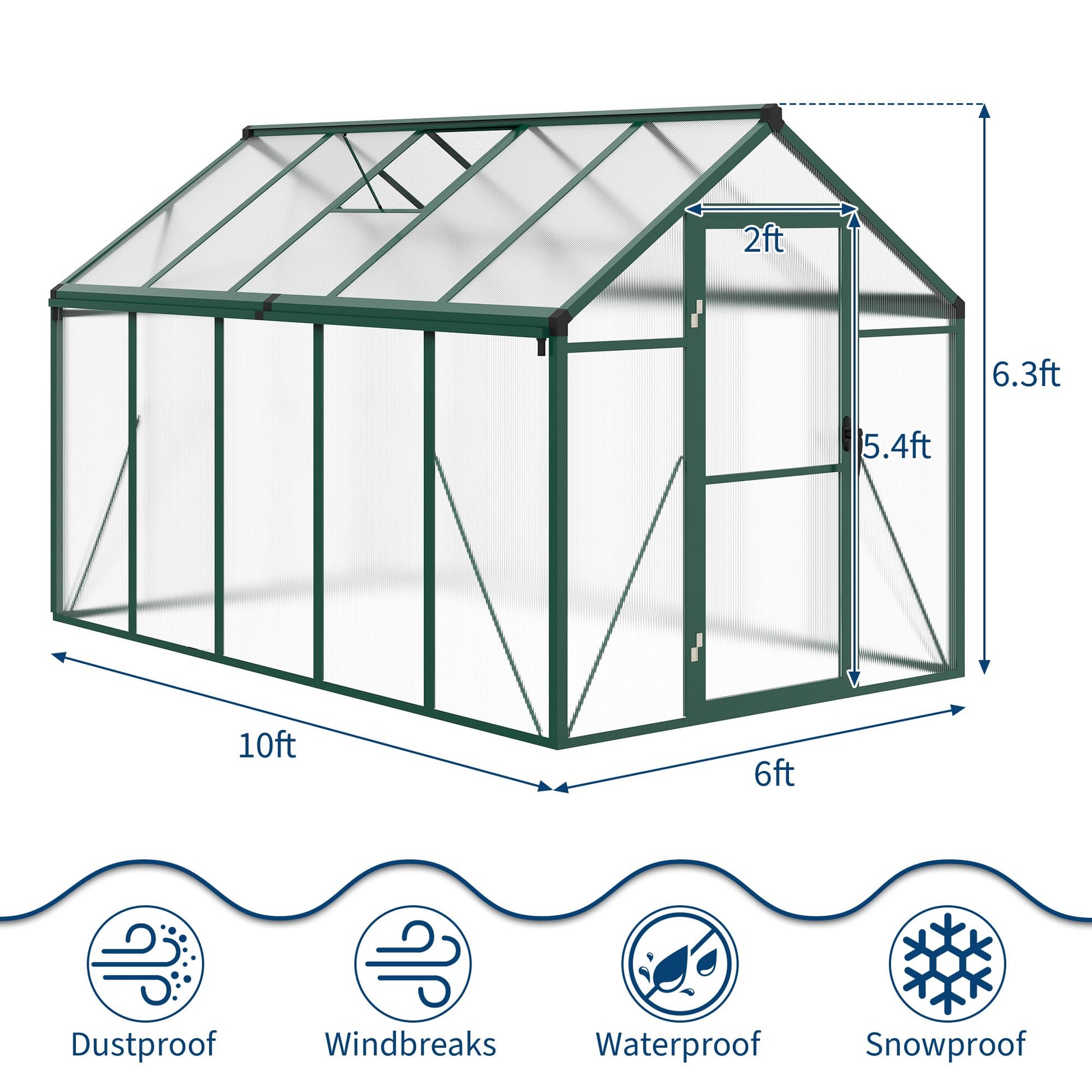 【Resilient Construction】Designed to endure challenging weather, our greenhouse features 720g/m² polycarbonate panels and a solid aluminum steel frame. This design ensures stability and protection during heavy rain and gale. Keep your plants safe and thriving in a reliable greenhouse built to last.