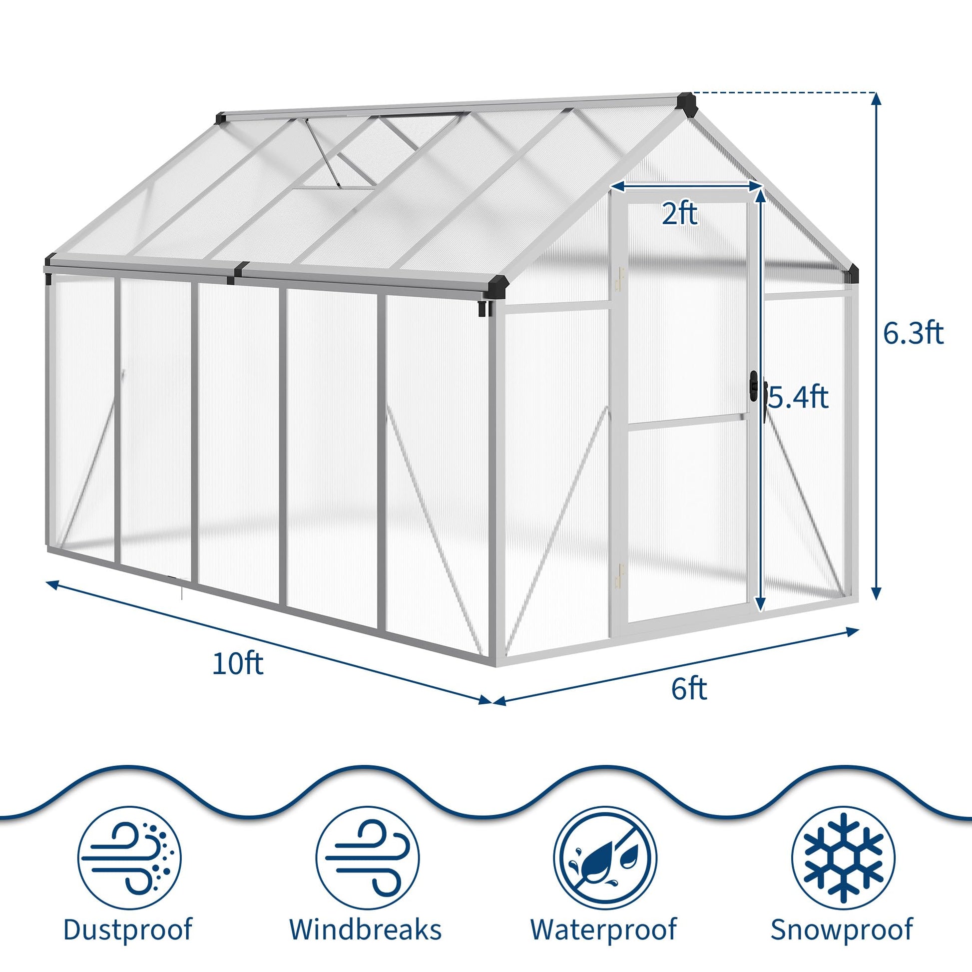 6x10 FT Greenhouse, Easy Assembly Aluminum Polycarbonate Greenhouses for Outdoors with Roof Vent and Ground Nails, Heavy Duty Aluminum Walk-in Greenhouse for Backyard, Sliding Lockable Door, Silver