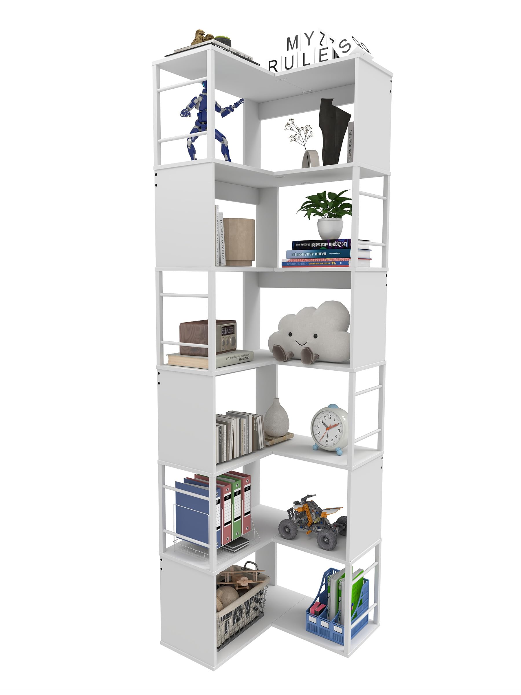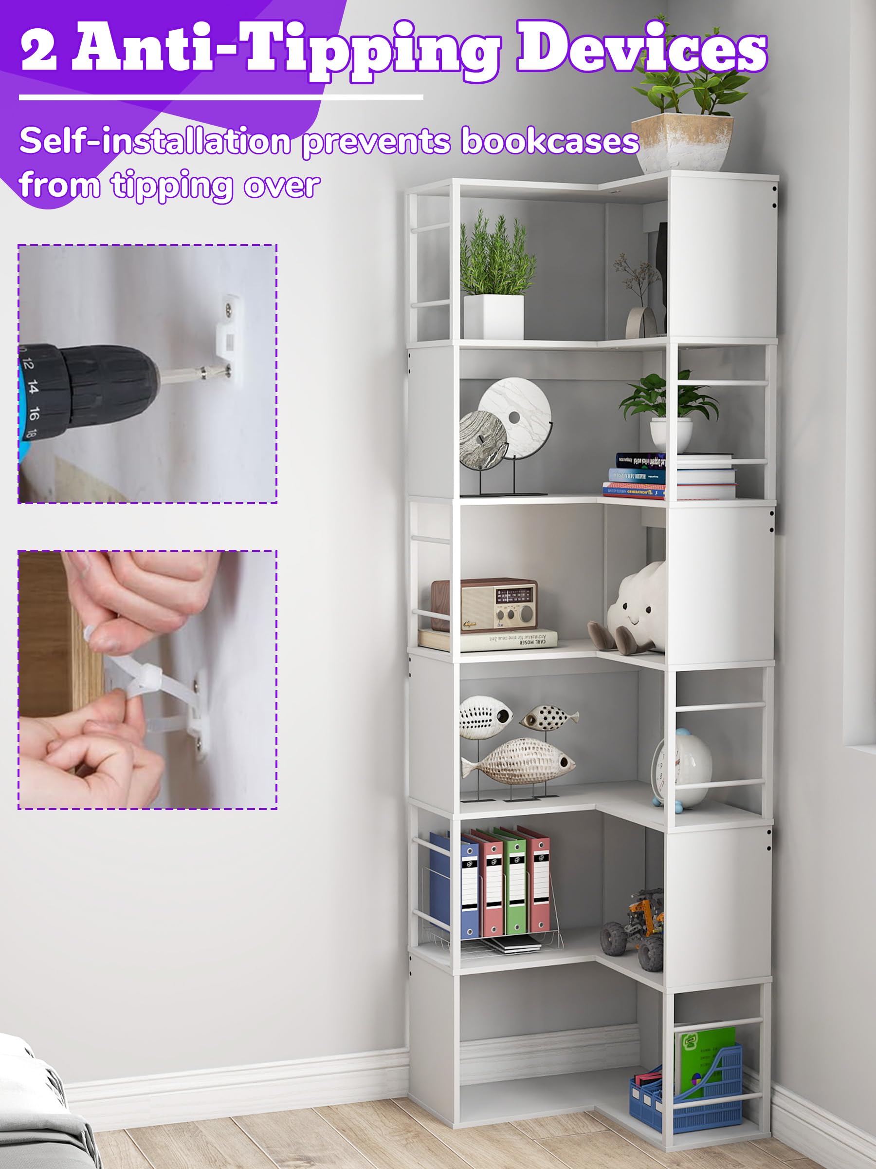 7 Tier Corner Bookshelf 74 Inches Tall Corner Bookcase Industrial L Shaped Book Shelf with Metal Frame Display Rack Storage Organize for Home Office,Living Room,Bed Room (White)