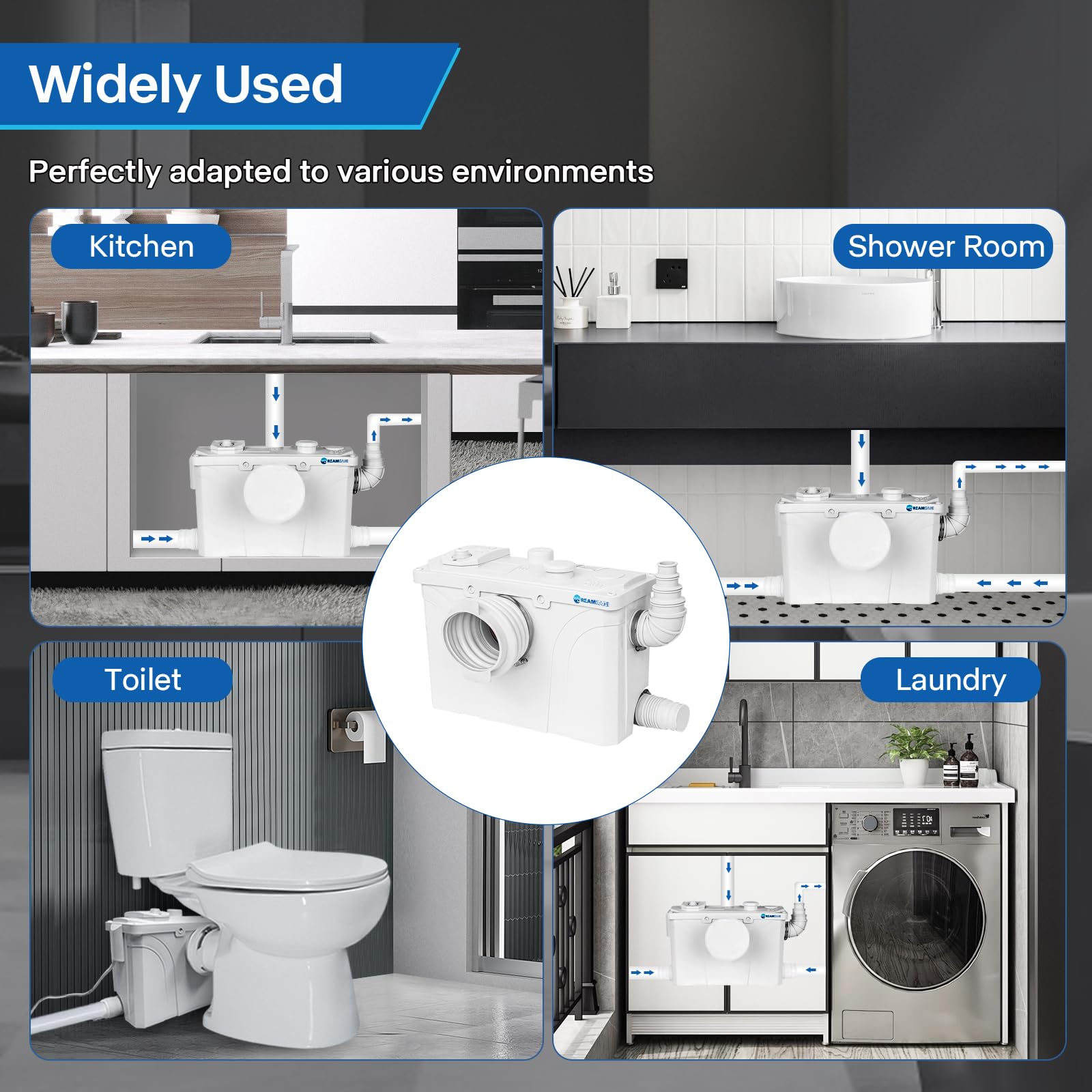 Wide Application -- Designed to pump away the waste from toilet, washbasin, bidet, shower, kitchen sink, dishwasher and laundry machine and also perfect for basements or other areas where the toilet is below the main line