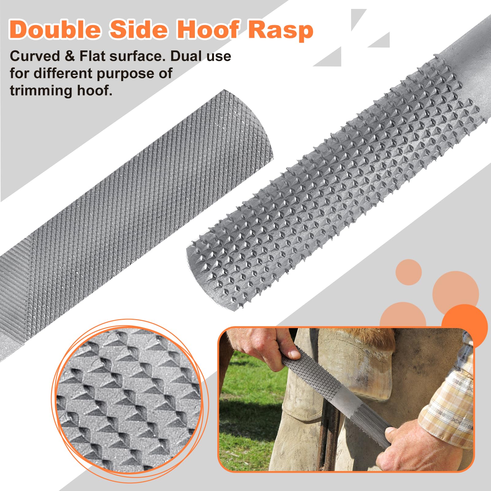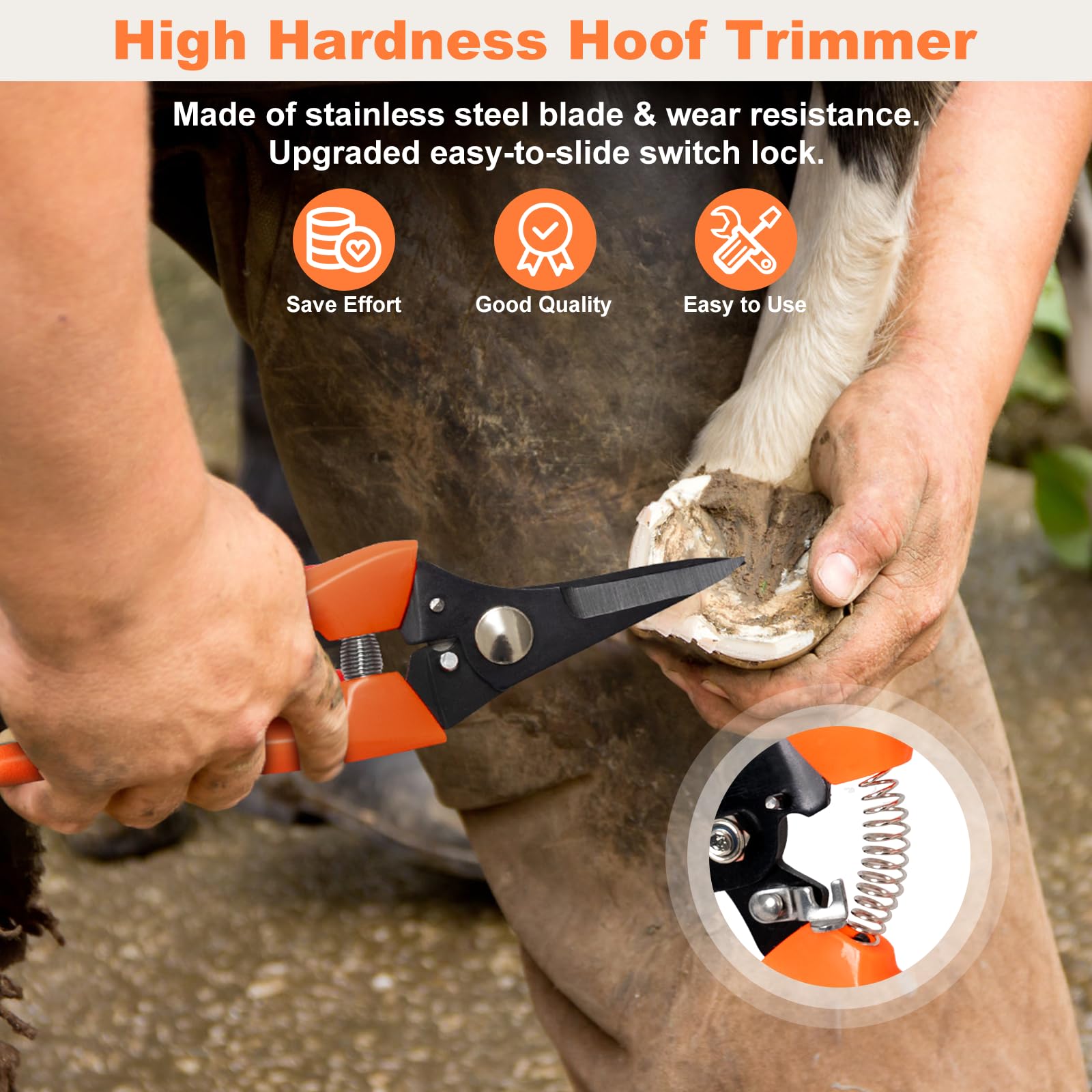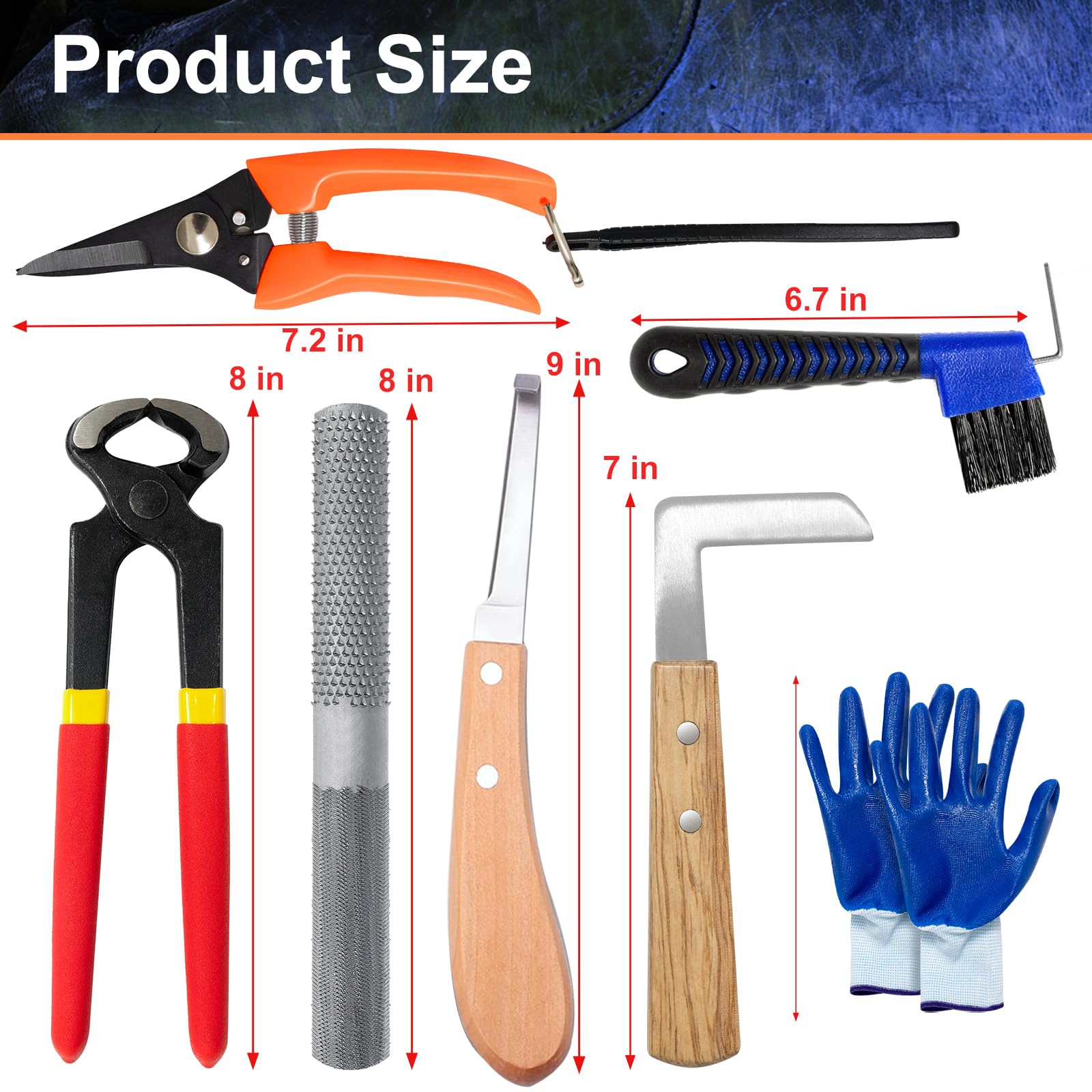 Professional 8 Piece Farrier Tool Kit: The goat hoof trimmers includes all necessary tools for efficient hoof maintenance, including a hoof nipper, rasp, knife, trimming shears, horseshoe brush, gloves, and a convenient storage bag. The kit offers a cost-effective solution compared to purchasing each tool individually, providing everything you need for efficient hoof care in one package