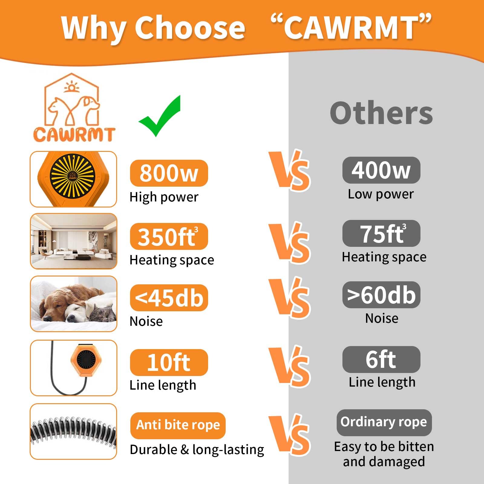【800W Fast Heating】Choose between 800W high or 400W low settings based on the weather. The built-in fan circulates warm air for even heating throughout the kennel