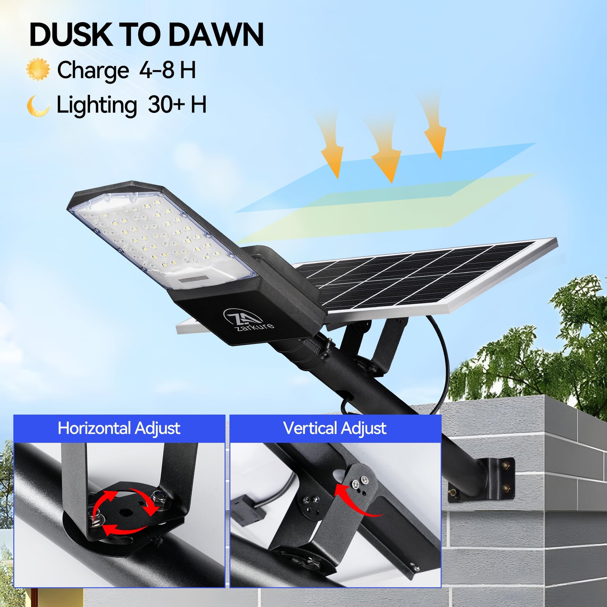 SOLAR STREET LIGHTS: The 9500W solar security light has built-in 56 5054 super bright LED lamp beads and 40000mAh battery (lifespan up to 95,000 hours). Solar powered, no electricity bills, automatically turns on at dusk, charges during the day, and continuously illuminates for more than 28 hours (when fully charged). Best for commercial and garden lighting(There is only one solar panel available)