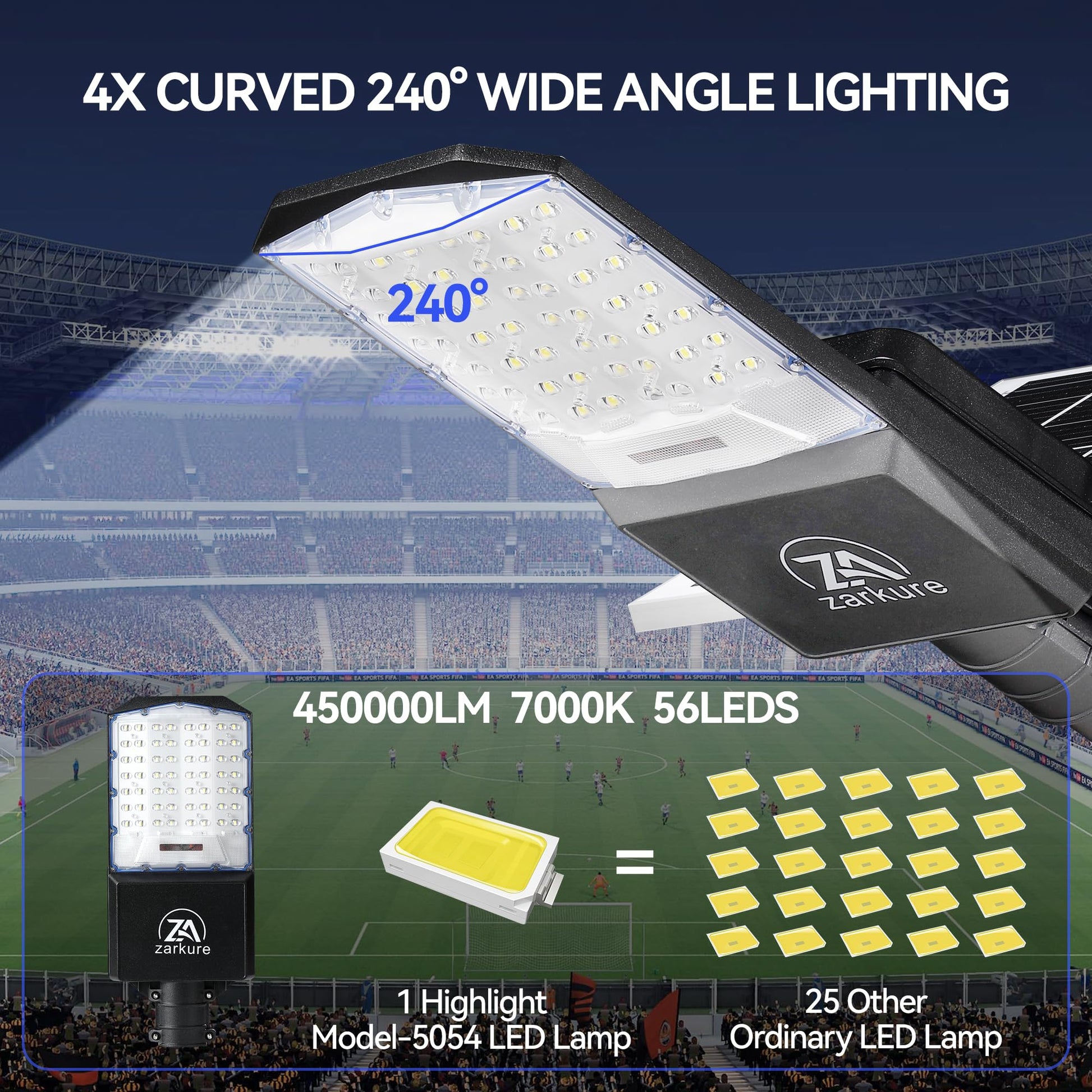 SUPER BRIGHT LED BEADS: Designed with 56 first-class super bright 5054 type LED beads, only one is equivalent to the brightness of 40 ordinary beads. The lighting area is up to 7000 square feet, reducing lighting blind spots. The outdoor heavy-duty solar street light is made of all-aluminum, with better heat dissipation and a service life extended by 10 times