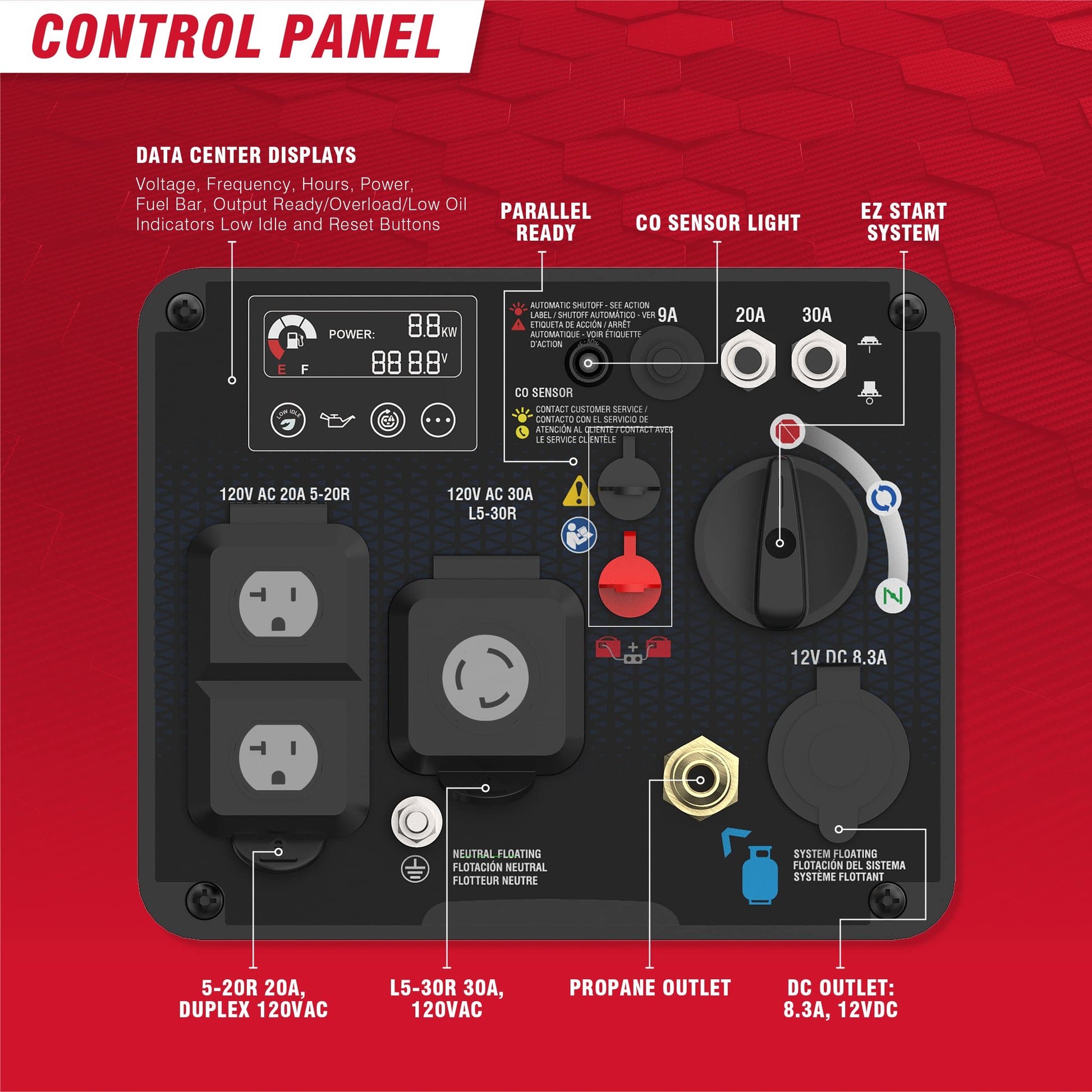 Multi-Featured Control Panel: The control panel consists of CO sensor indicator light, LED light, data center display, 1x 8.3A 12VDC, 1x L5-30R 30A 120V, 1x Duplex 5-20R 20A 120V.